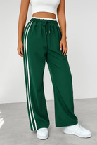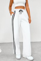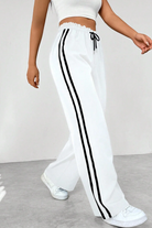 Relaxed, sporty, and easy to style. These navy wide-leg track pants are designed with a high elastic waistband, adjustable drawstring, and bold white double side stripes for a classic athletic finish. Perfect for casual days, travel, or laid-back streetwear looks, they pair effortlessly with sneakers, crop tops, or oversized hoodies.