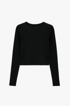 A polished women’s ribbed button-front long sleeve top in black. Cut in a cropped, slim silhouette with an off-center placket and soft stretch knit for all-day comfort and clean layering. Style it buttoned up or slightly open for easy polish.