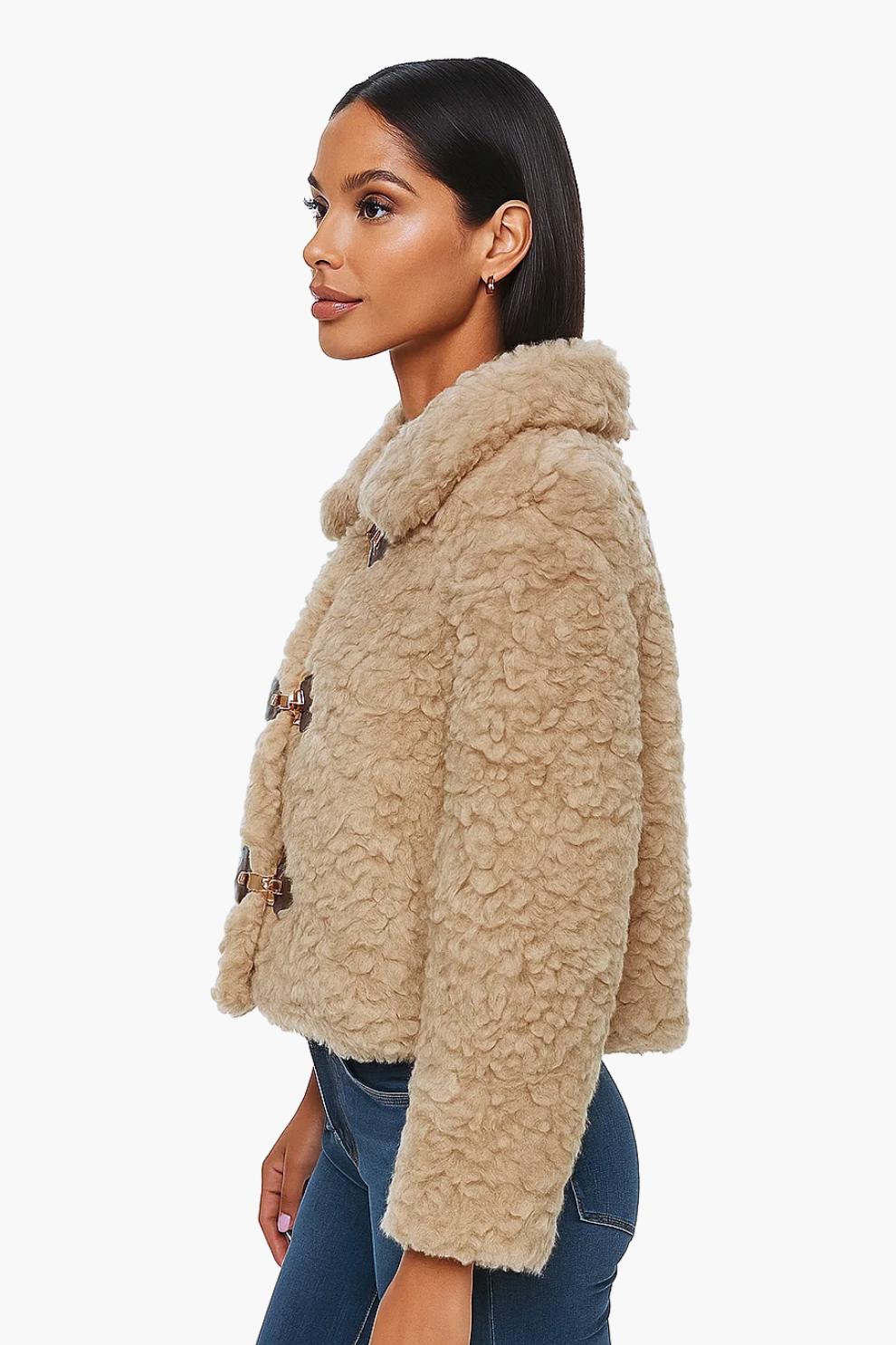 A cosy statement layer with a premium feel. This Sherpa Toggle Jacket wraps you in plush texture and easy warmth. The curly faux-shearling pile and gold-tone toggles deliver warmth and polish. Boxy, cropped silhouette for modern proportion and soft stand collar for extra warmth and comfort. Designed for everyday wear: warm, lightweight, and comfortable.