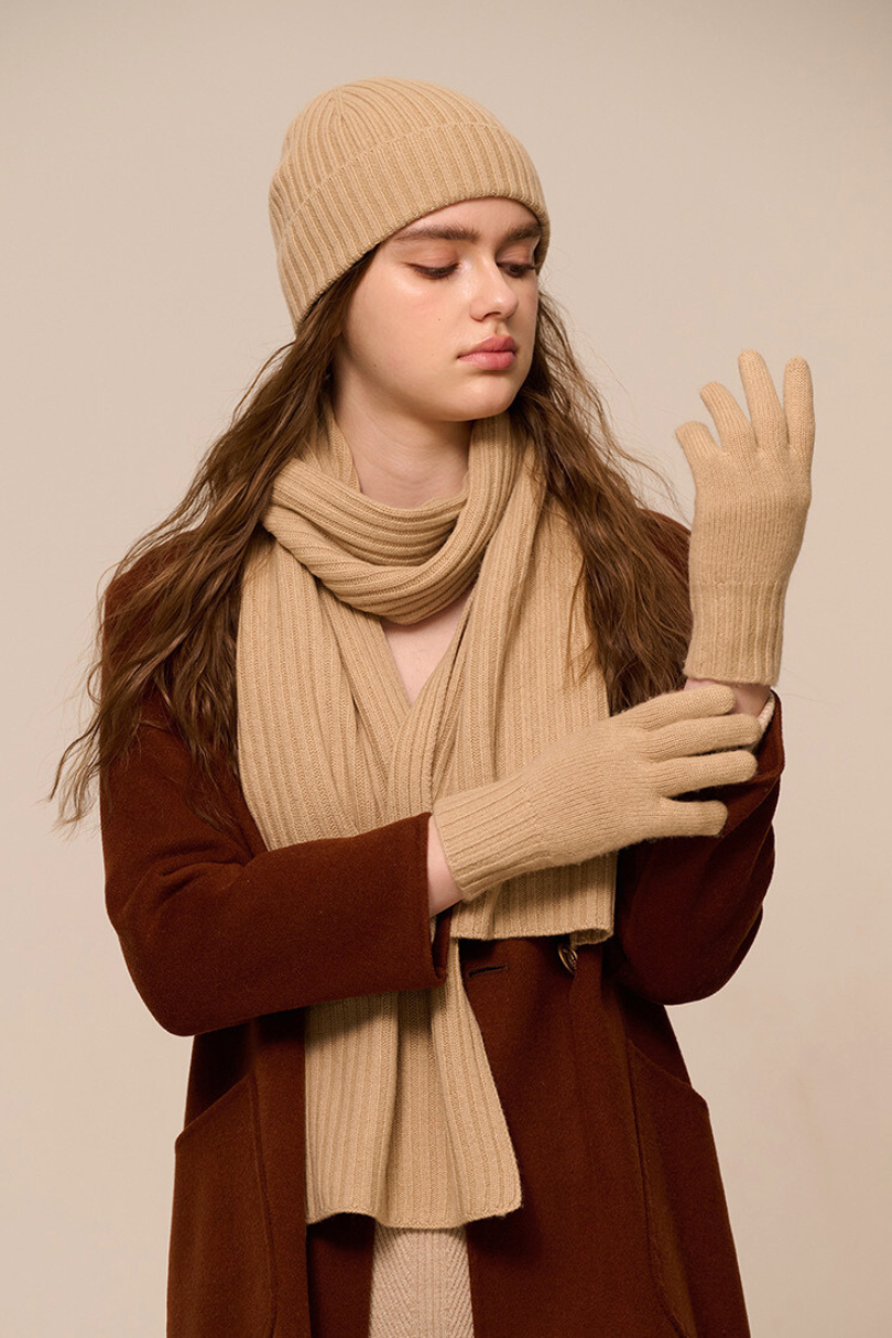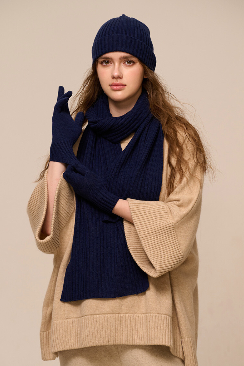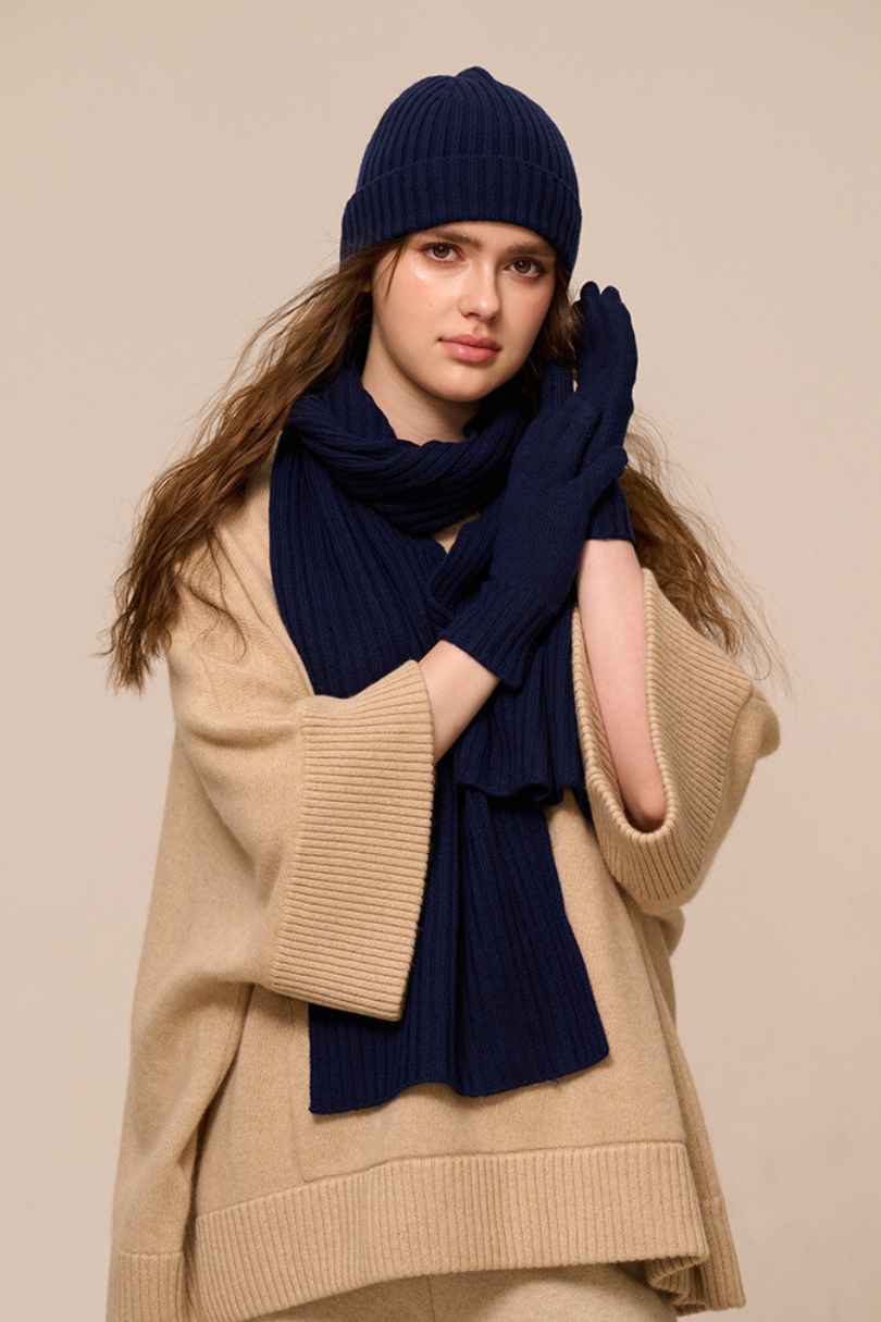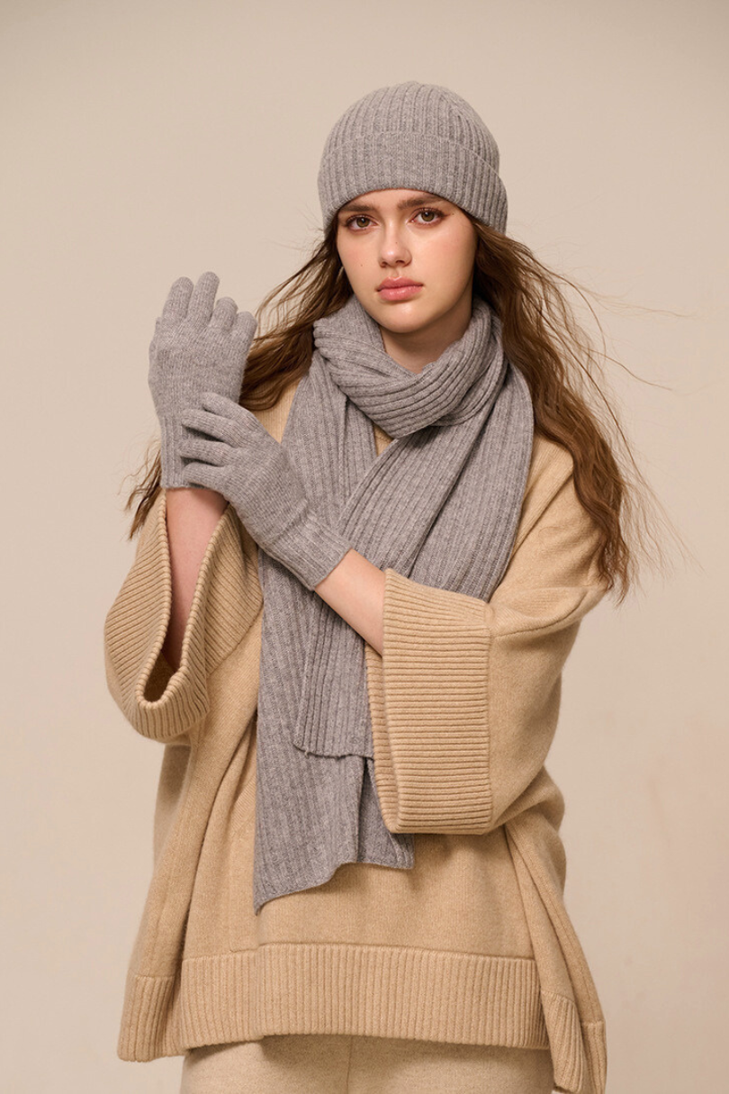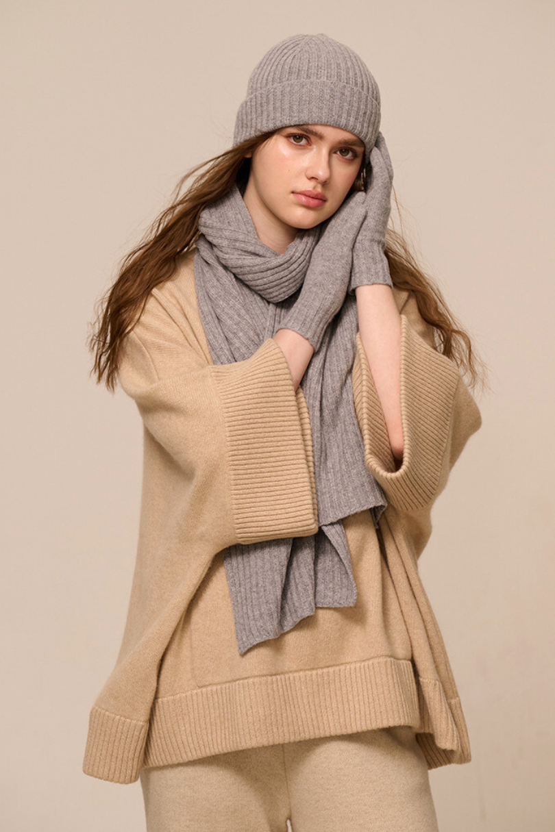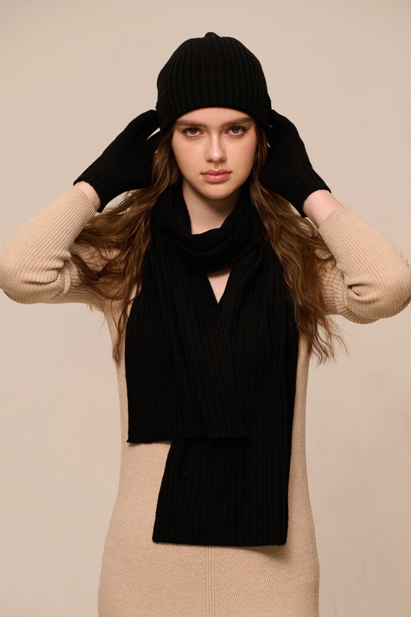 - Design: Clean rib-knit beanie, soft draping scarf with smooth edges