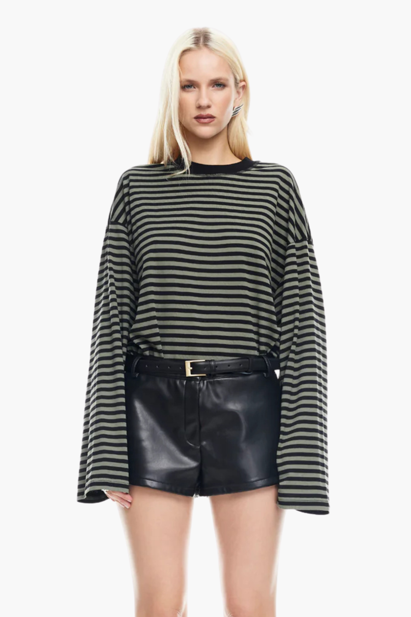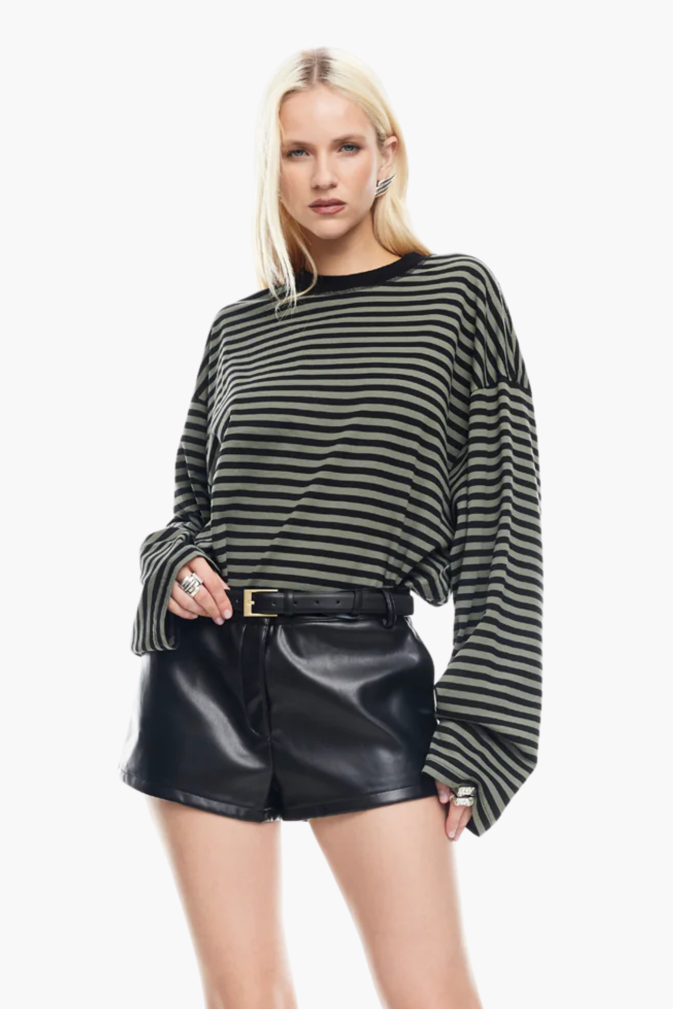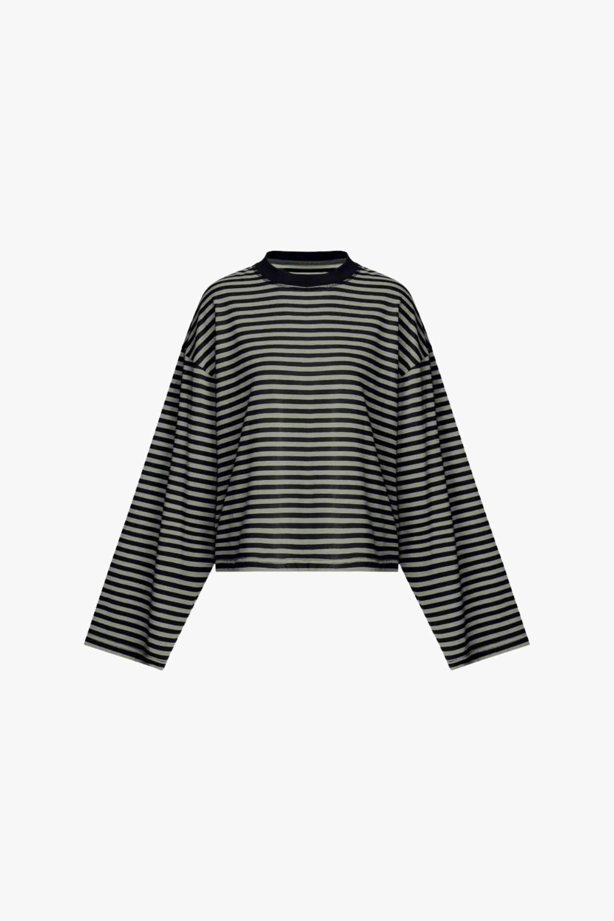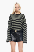 A modern take on the striped knit. The oversized long-sleeve shirt drapes cleanly with a relaxed, boxy silhouette that feels easy yet polished. The ribbed crew neckline and tidy rib trims keep the shape neat. Perfect with denim, trousers, or a slip skirt.