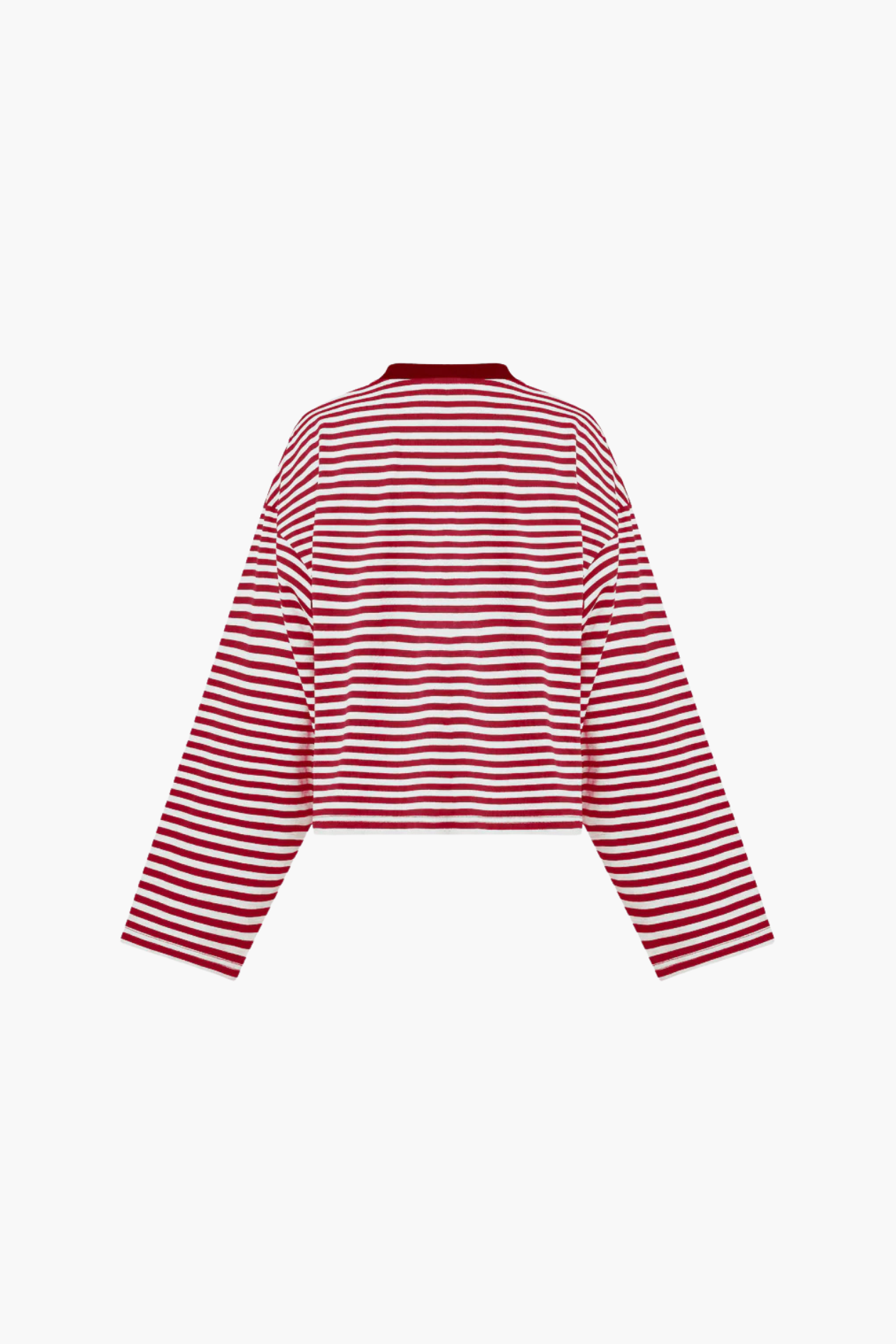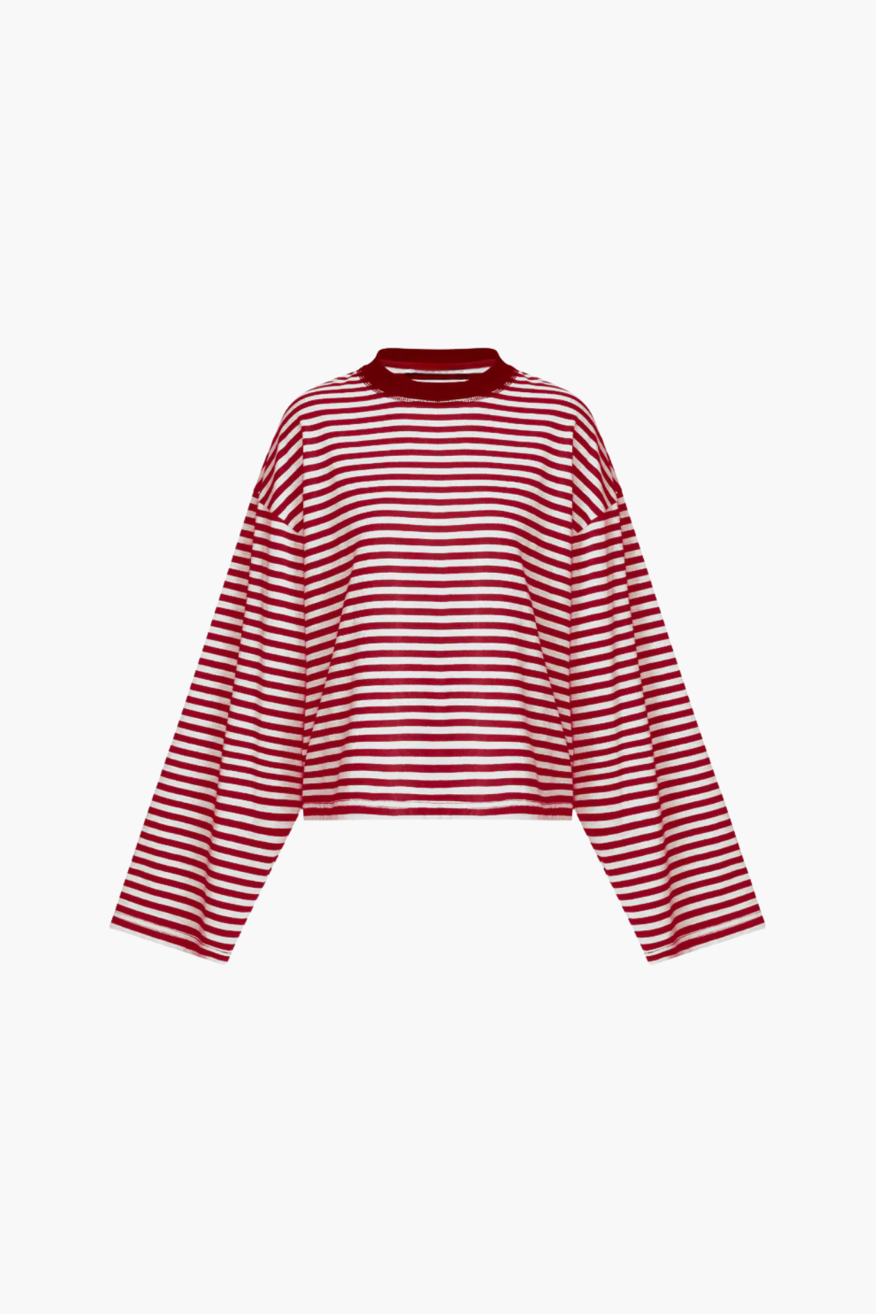 A modern take on the striped knit. The oversized long-sleeve shirt drapes cleanly with a relaxed, boxy silhouette that feels easy yet polished. The ribbed crew neckline and tidy rib trims keep the shape neat. Perfect with denim, trousers, or a slip skirt.