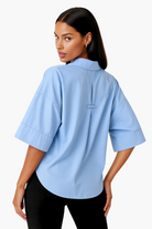 Crisp, modern, and effortless. This women’s shirt is cut from breathable cotton-blend poplin with an oversized fit, 3/4 sleeves, and a modern high-low hem. In fresh sky blue, it’s the versatile piece that works from desk to dinner with ease.
