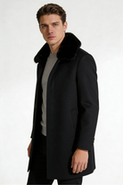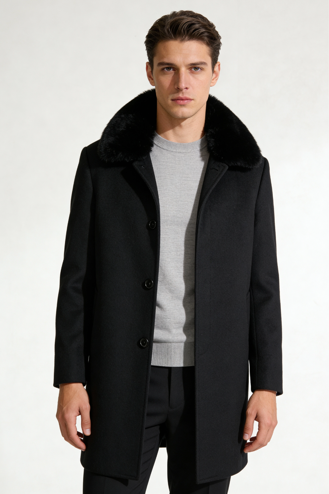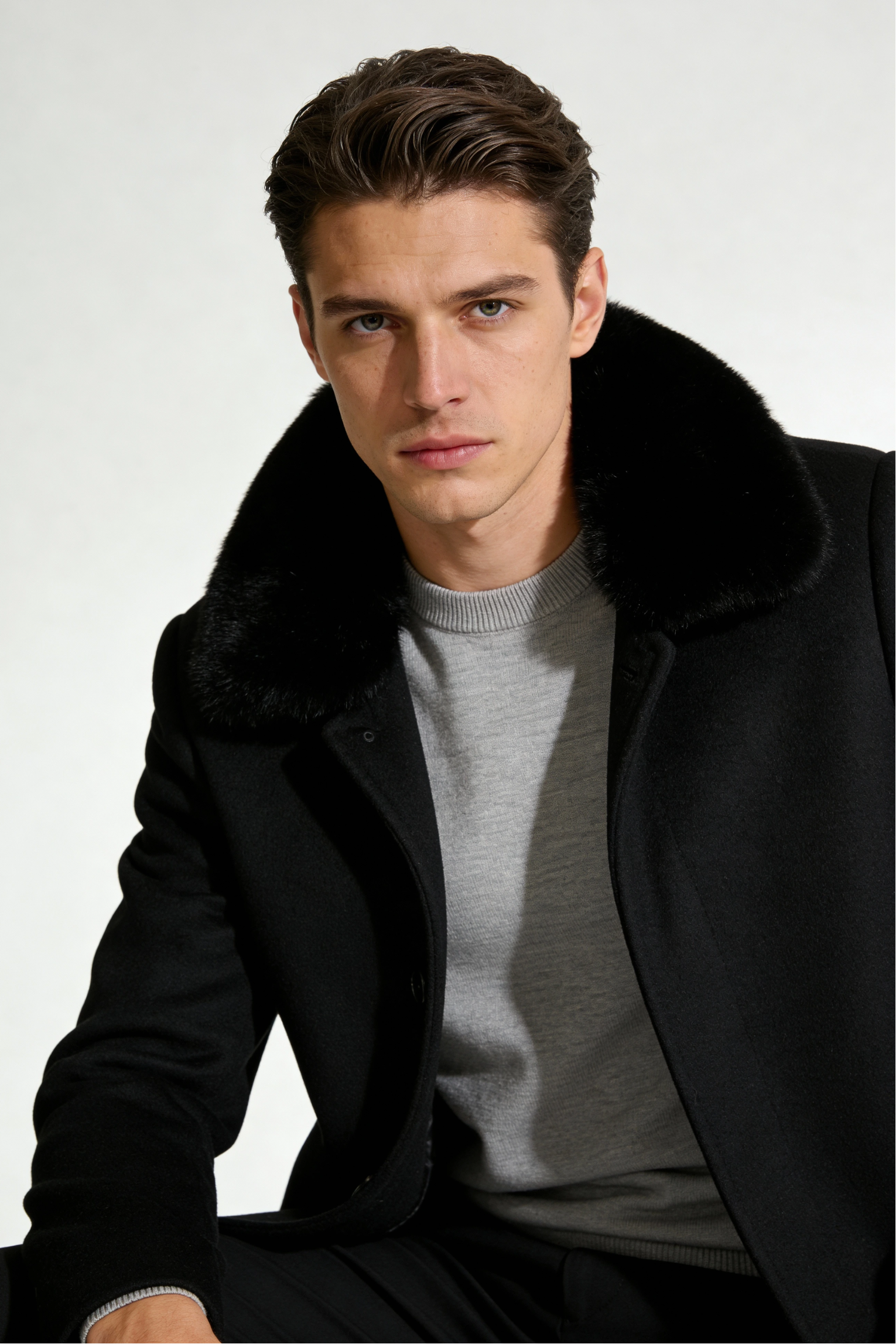 This men’s fur collar wool overcoat brings together timeless tailoring and modern luxury. Made from a warm, structured wool blend, it features a detachable fur collar that offers both refinement and versatility. The clean silhouette, smooth lining, and precise cut create a sharp winter coat designed for comfort, elegance, and confidence in cold weather.