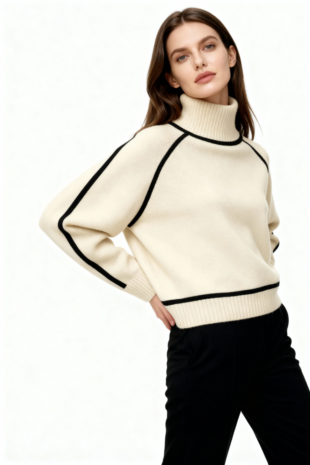 The Valerie Edge Turtleneck brings graphic contrast to a timeless winter essential. Crafted from a soft, structured cotton blend, it features a high ribbed collar and clean lines sharpened by bold black piping. Elevated, modern, and easy to style — it’s the statement knit that pairs effortlessly with denim, coats, or wide-leg trousers.