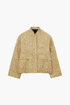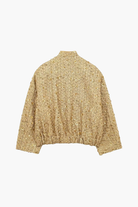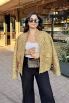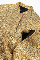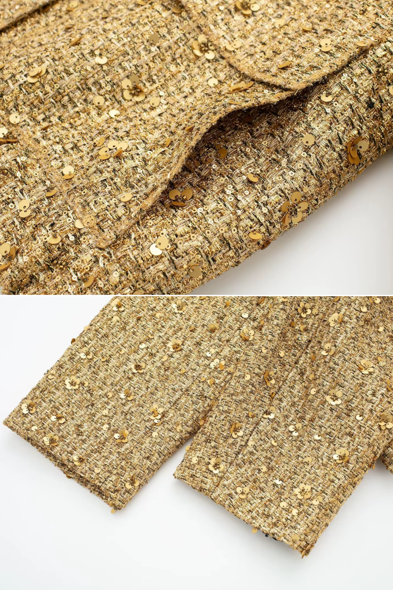 The Marigold Tweed Jacket combines classic tailoring with a luxe, luminous finish. Designed with golden sequins woven throughout a rich tweed base, this cropped silhouette adds instant polish and radiance to any outfit.