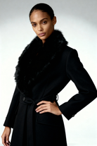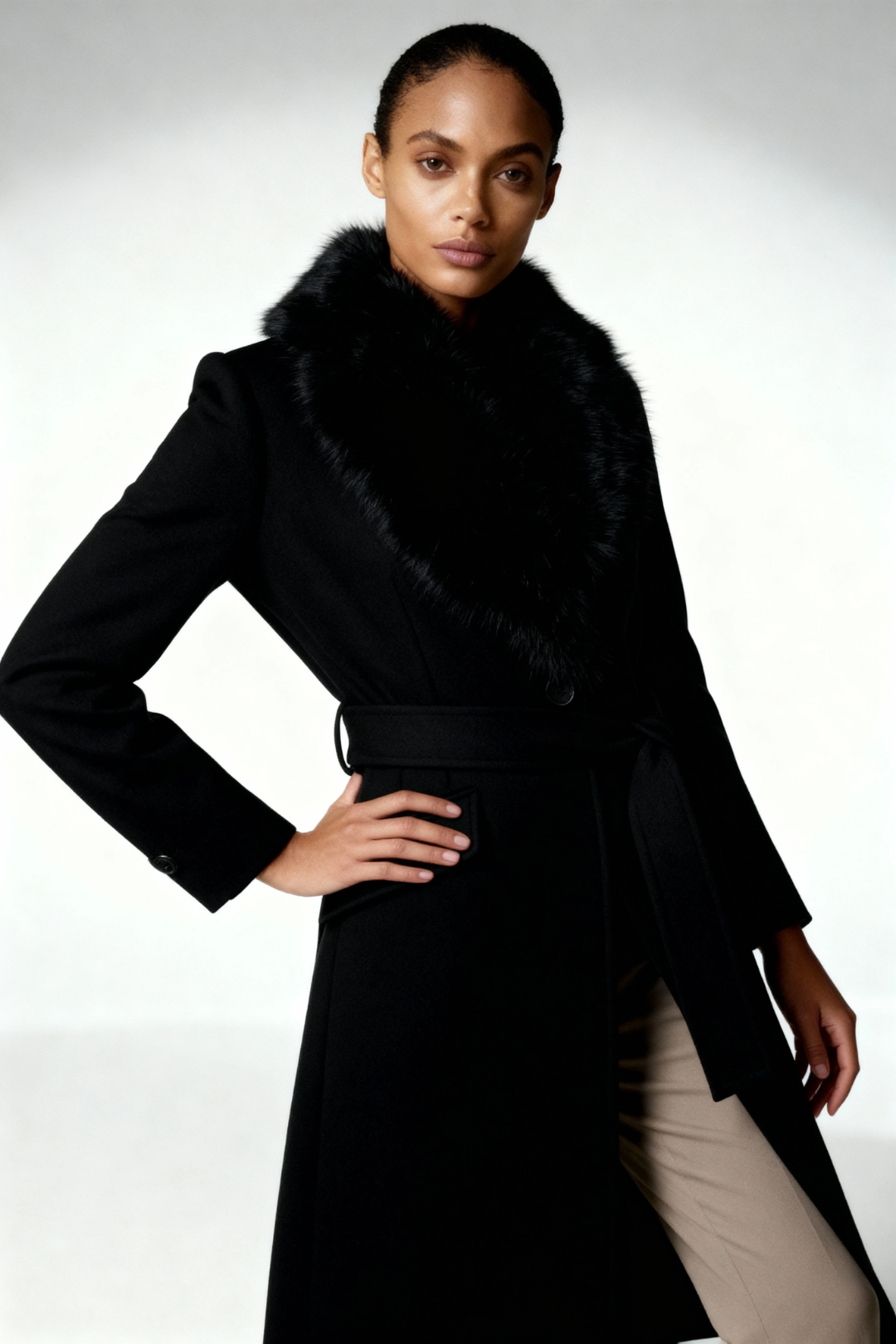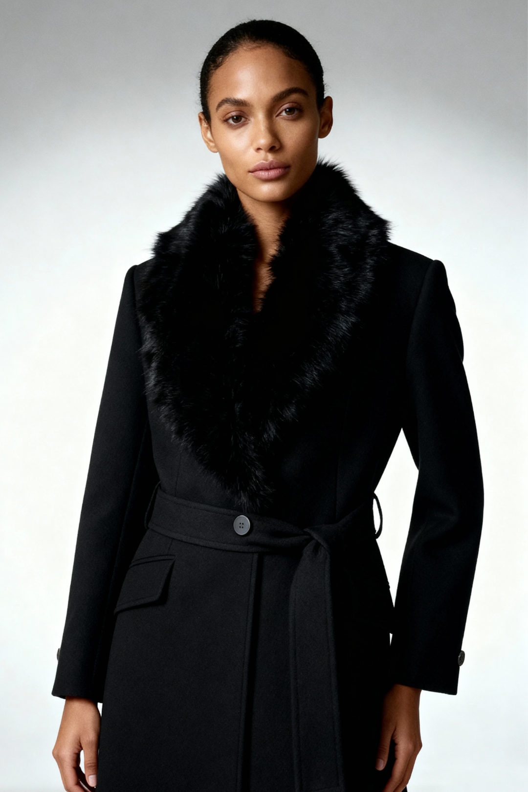 The Amara Wool Coat redefines classic outerwear with soft structure and refined detail. Crafted from a premium wool blend, it features a detachable faux fur collar, waist belt, and clean tailored lines that flatter every silhouette.