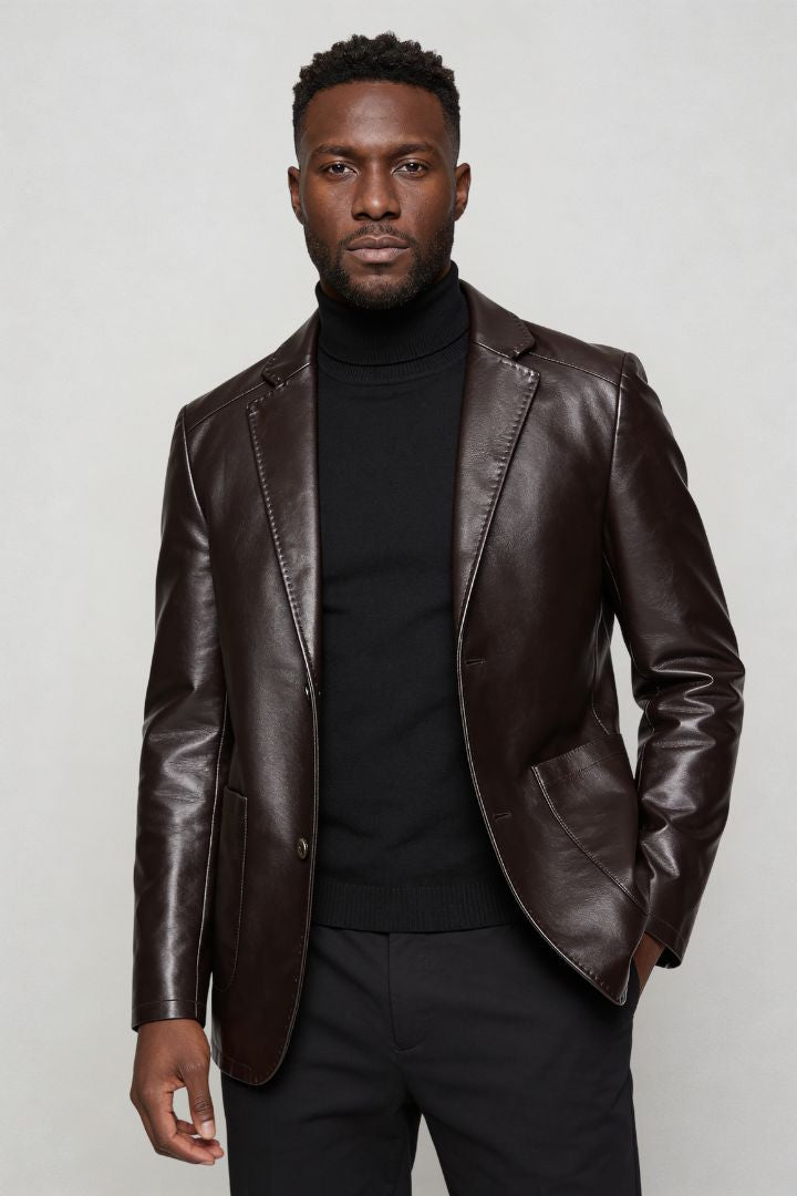 The Matteo Tailored Vegan Leather Blazer delivers sharp tailoring with a smooth, structured finish. Designed for confident layering, this modern essential bridges formal refinement and contemporary street polish.