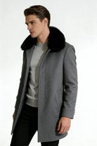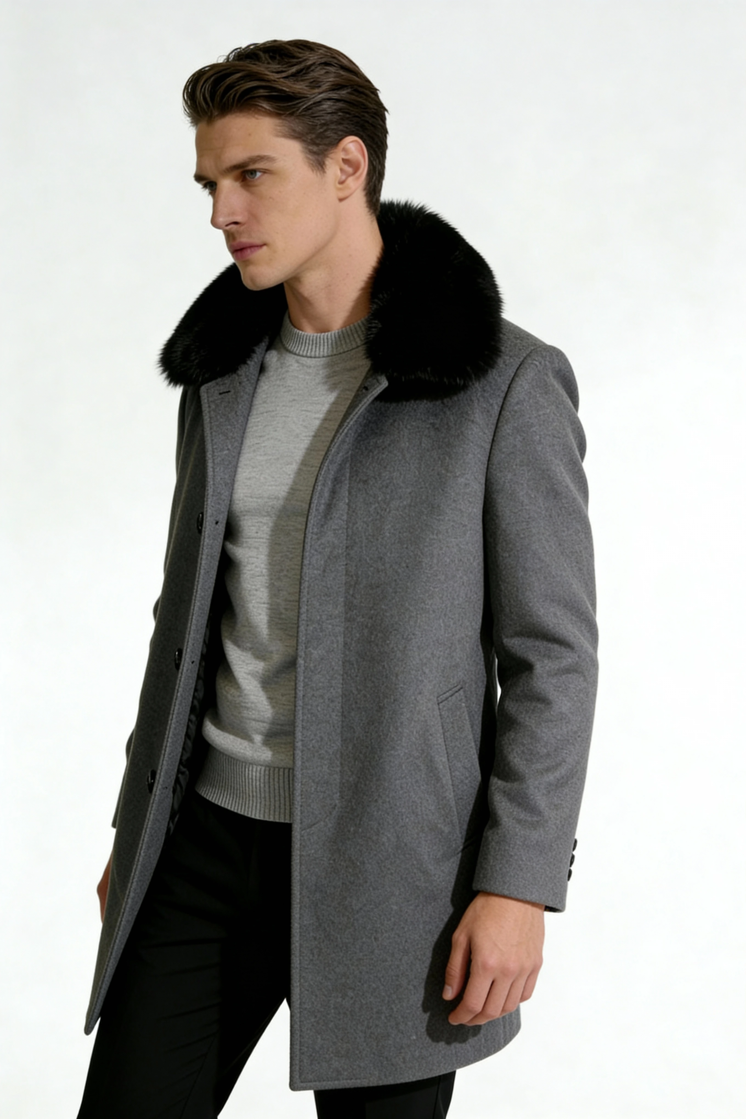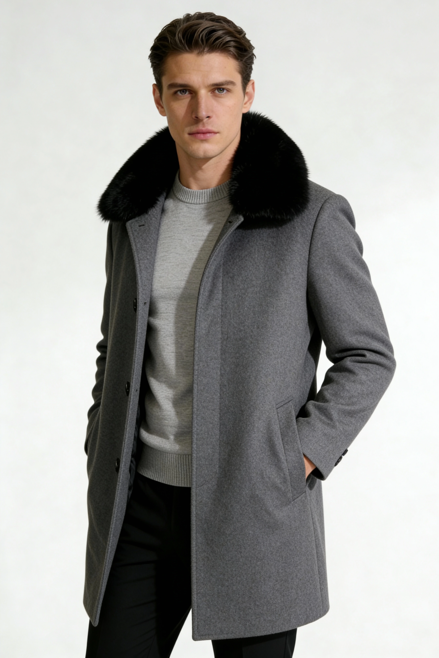 This men’s fur collar wool overcoat brings together timeless tailoring and modern luxury. Made from a warm, structured wool blend, it features a detachable fur collar that offers both refinement and versatility. The clean silhouette, smooth lining, and precise cut create a sharp winter coat designed for comfort, elegance, and confidence in cold weather.