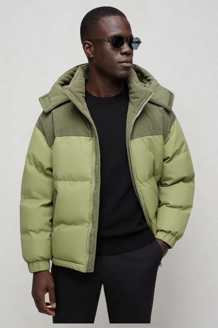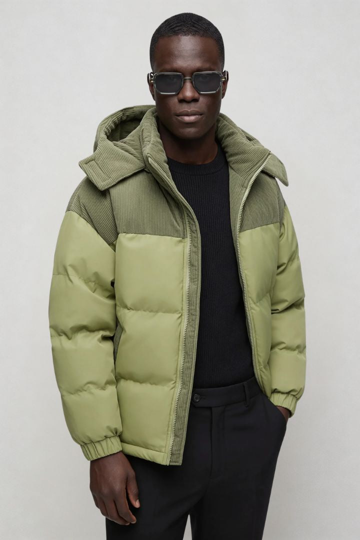 The Aurion Corduroy Puffer Jacket blends modern insulation with refined texture. Crafted from soft structured polyester and finished with corduroy panel detailing, it delivers warmth, durability, and contemporary style in one complete winter layer. Designed for colder days without sacrificing silhouette.