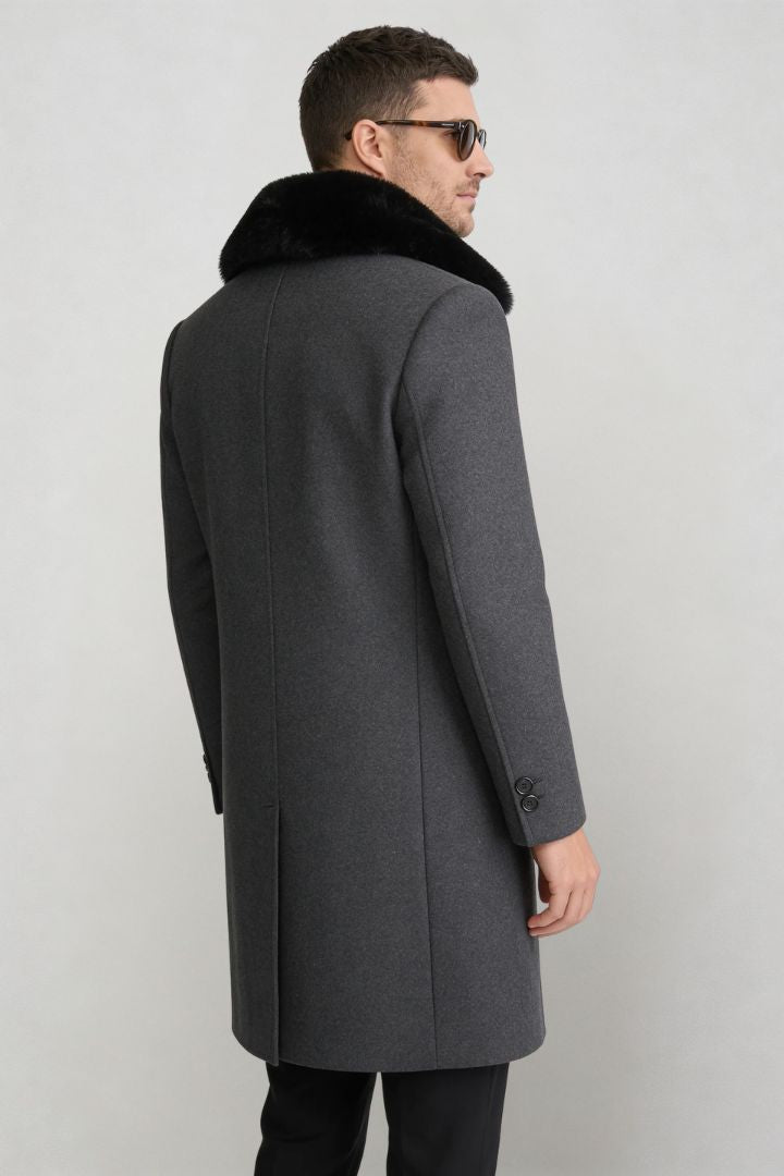 This men’s fur collar wool overcoat brings together timeless tailoring and modern luxury. Made from a warm, structured wool blend, it features a detachable fur collar that offers both refinement and versatility. The clean silhouette, smooth lining, and precise cut create a sharp winter coat designed for comfort, elegance, and confidence in cold weather.