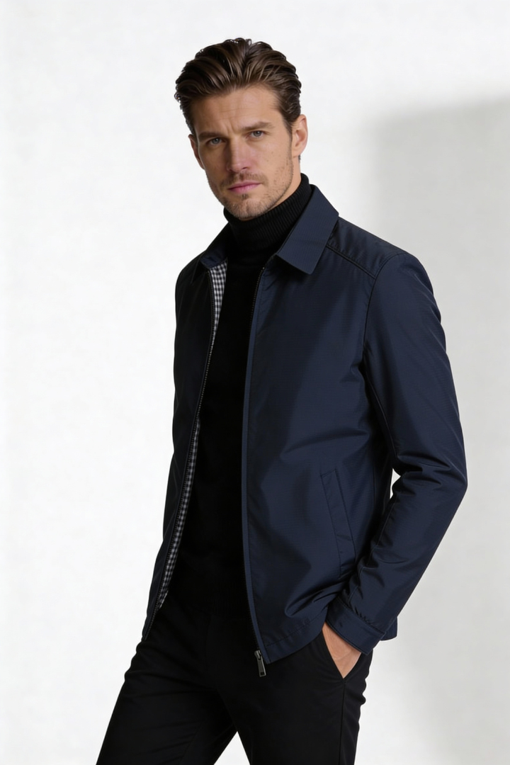 Designed for versatile everyday wear, this men’s lightweight jacket delivers a clean, modern silhouette with an effortlessly refined feel. Crafted from a durable polyester blend, it offers a smooth finish, lightweight structure, and wind-resistant protection for added comfort during cooler days. The streamlined zip-front design creates a sharp, confident look that elevates any outfit. A dependable essential for spring, fall, and cool nights.