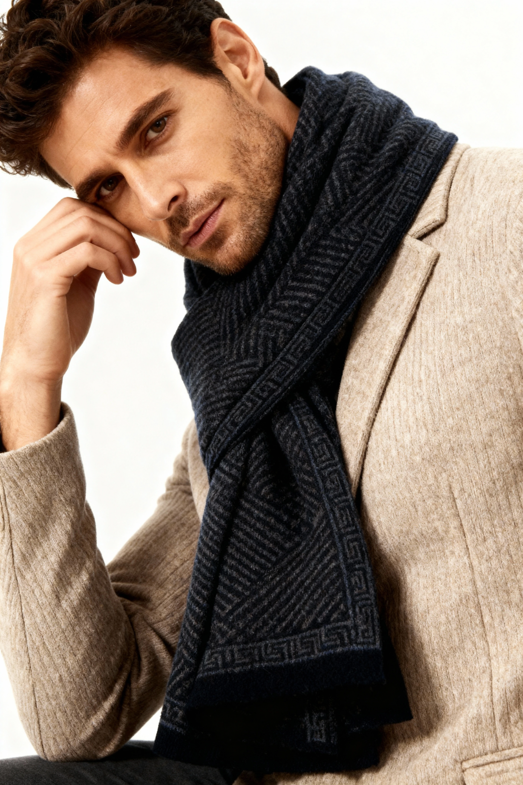 The Corvell scarf is crafted from 100% premium wool, offering a naturally warm, breathable, and luxuriously soft feel. The deep navy tone pairs with a sophisticated woven geometric pattern, creating a look that’s both modern and timeless.