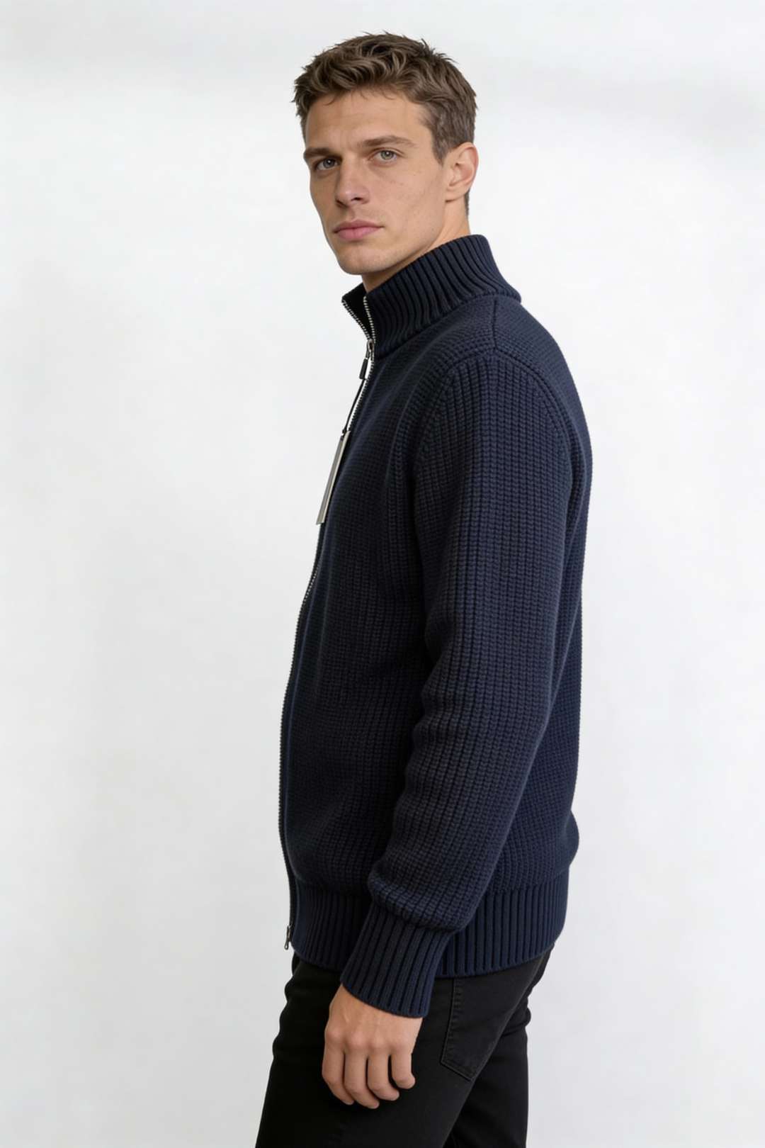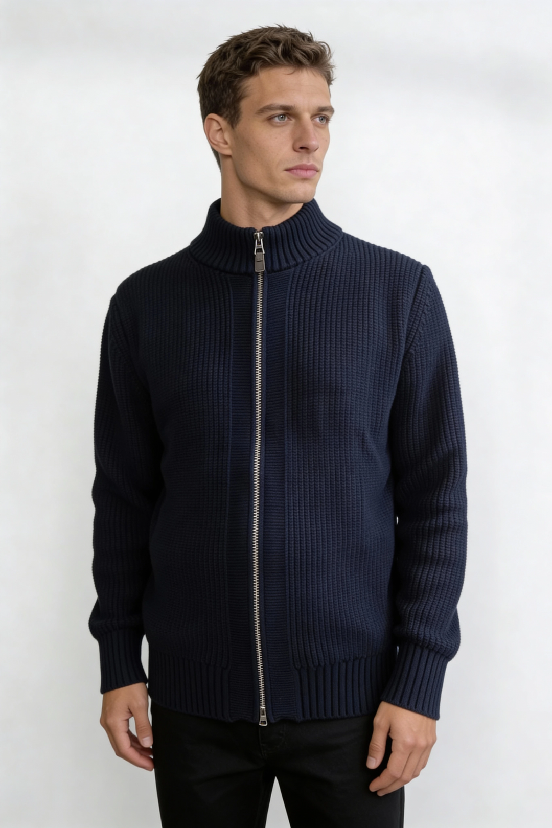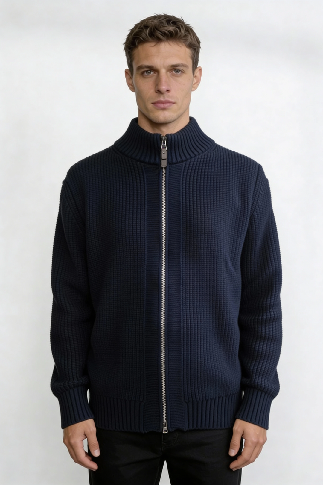 Designed for effortless everyday wear, this men’s zip-up sweater jacket is crafted from 100% cotton for breathable comfort and natural softness. The ribbed knit texture adds subtle structure, while the full-zip front and stand collar create a clean, modern silhouette. Easy to layer yet polished on its own, this cotton sweater jacket transitions seamlessly from casual days to smart off-duty looks.