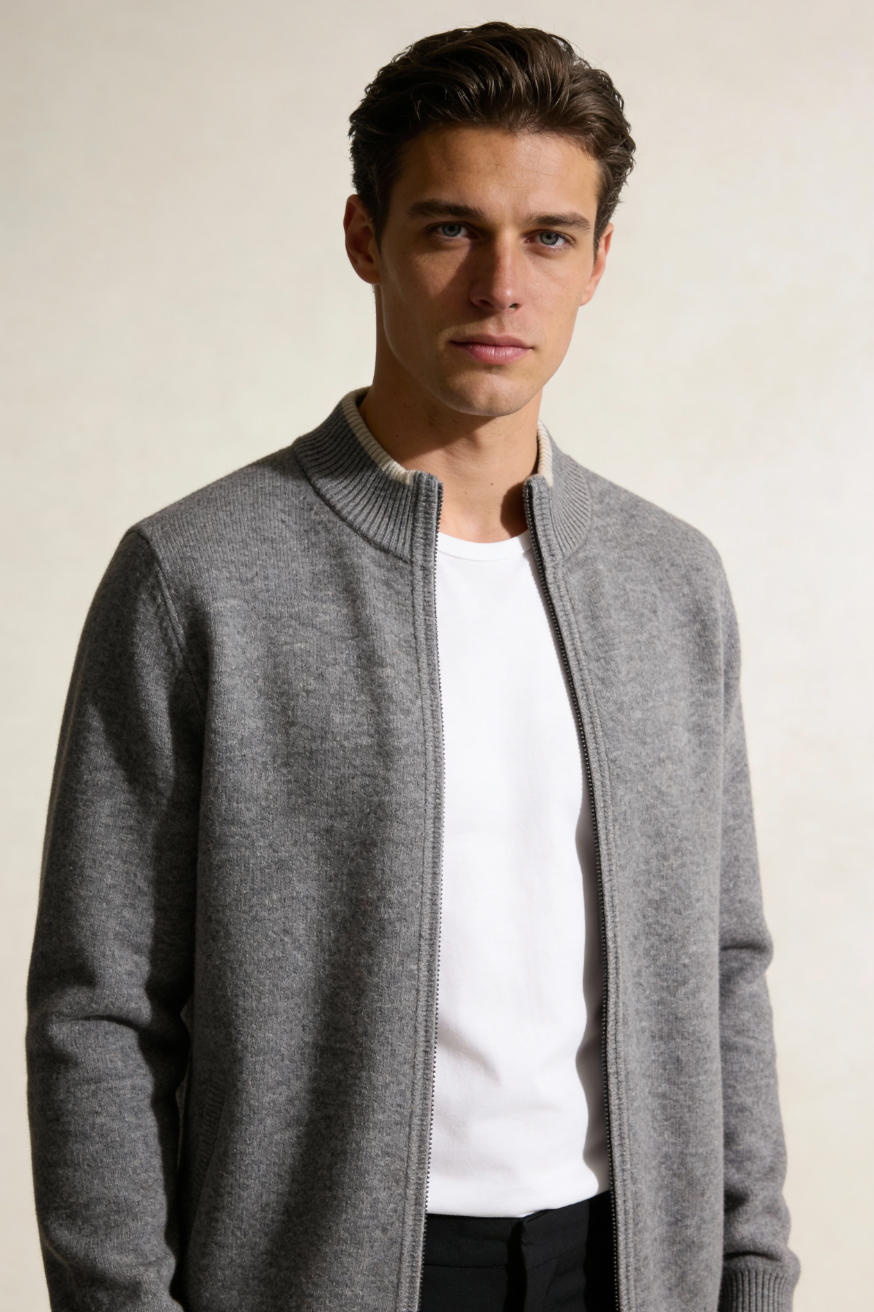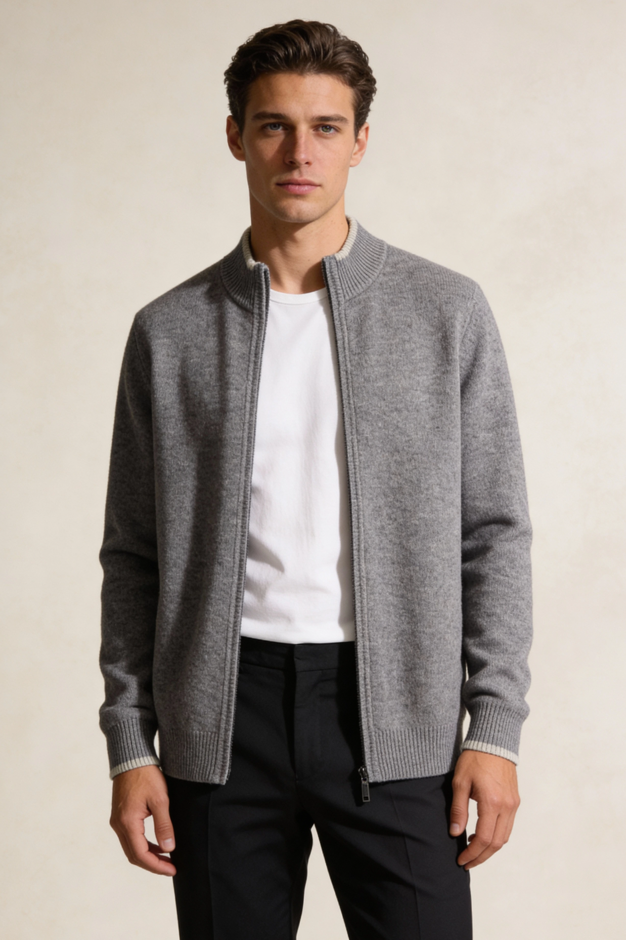 Designed for elevated simplicity, this Men’s Wool Zip Cardigan delivers warm, lightweight comfort with a clean, modern silhouette. The premium wool knit offers softness without bulk, while the full-zip front lets you layer effortlessly from workdays to weekend downtime. Finished with ribbed detailing and a tailored yet relaxed fit, it’s the versatile sweater jacket every man needs in his cold-weather rotation.