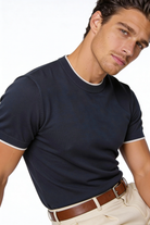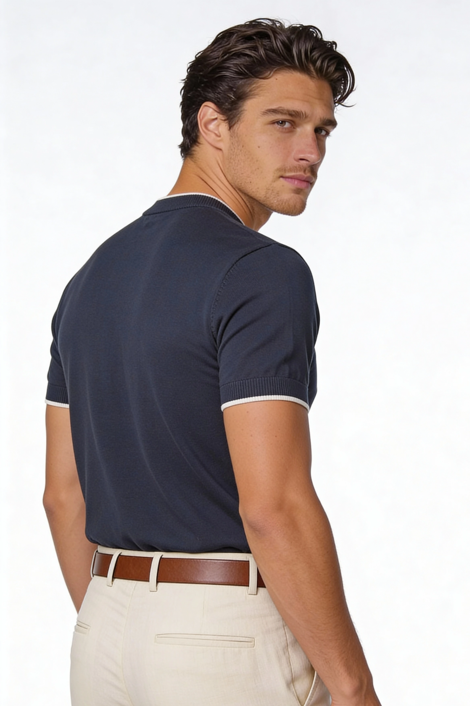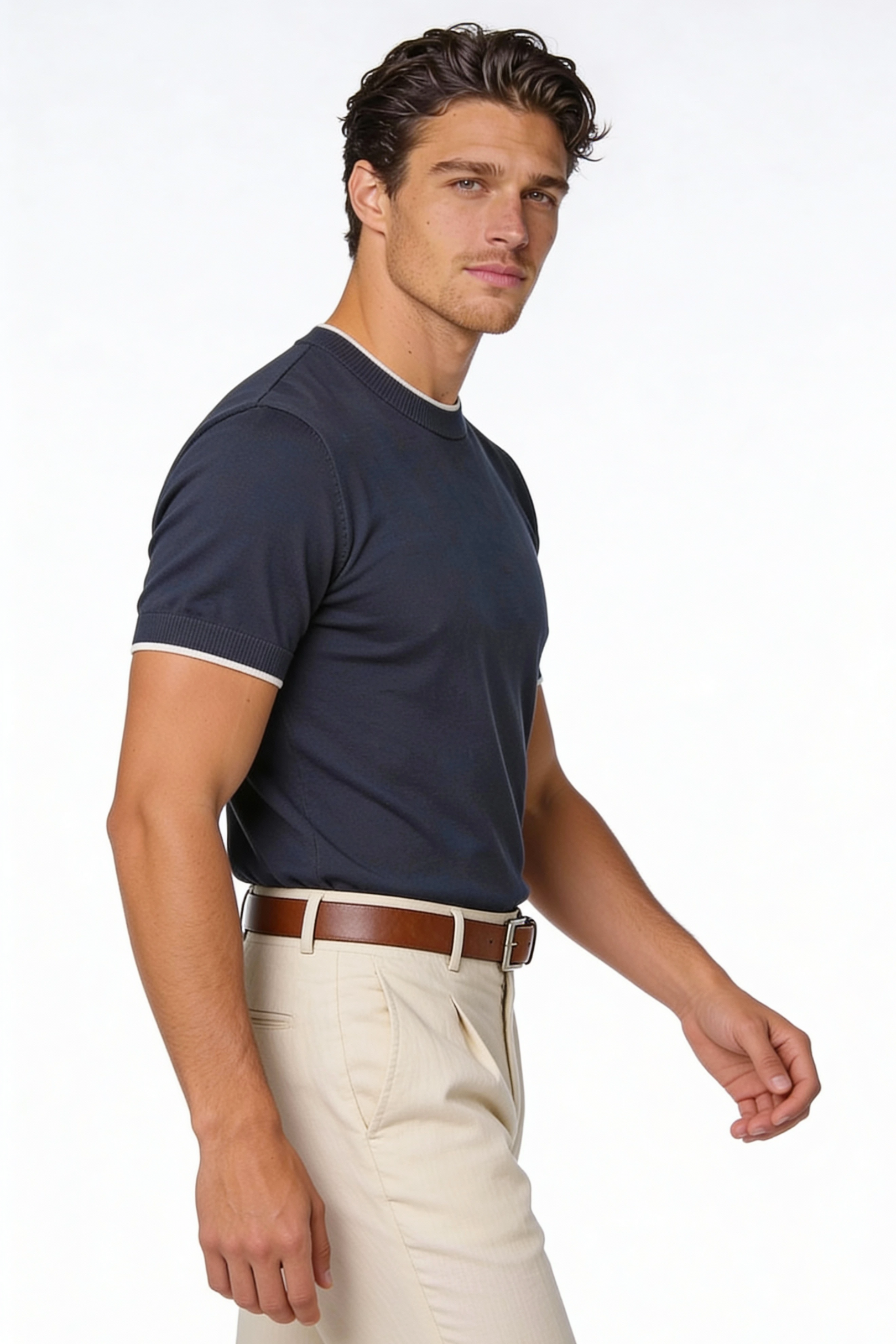 Designed for elevated everyday wear, this men’s luxury knit t-shirt blends premium materials with a clean, modern silhouette. Crafted from a breathable lyocell-cotton blend with silk and nylon for added softness and durability, it delivers a smooth, lightweight feel against the skin. The tailored fit and refined knit texture make it ideal for summer outfits, smart casual looks, and understated luxury.