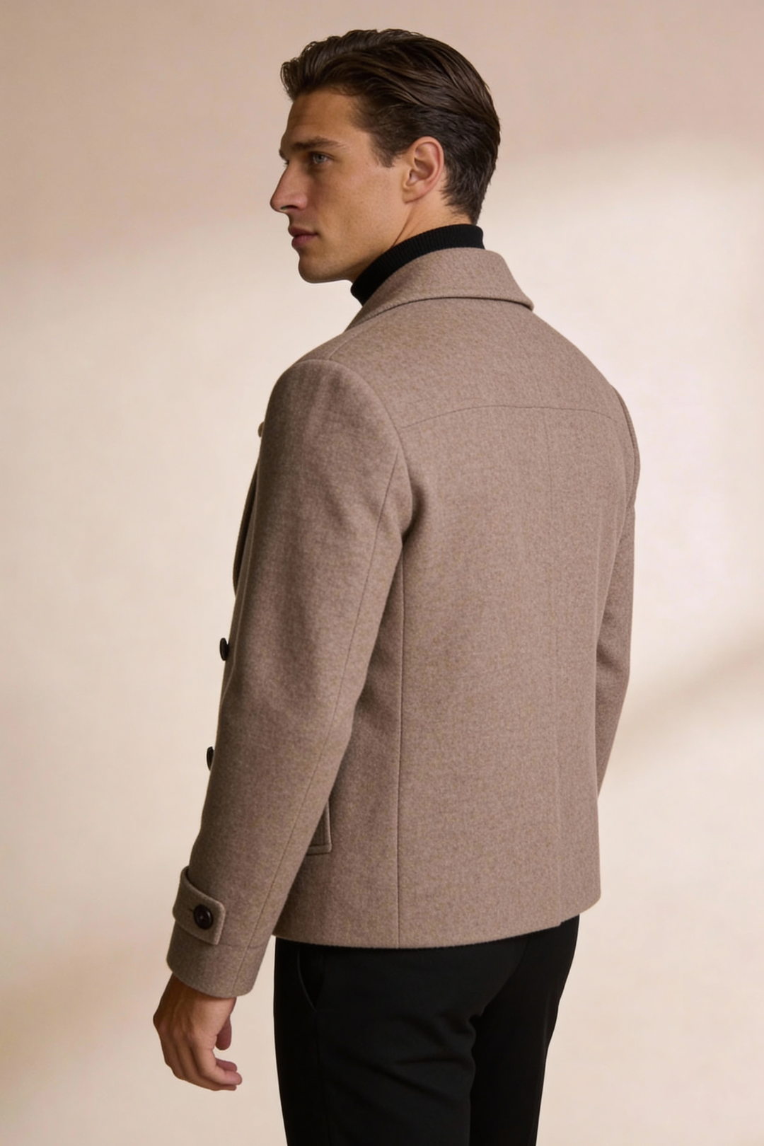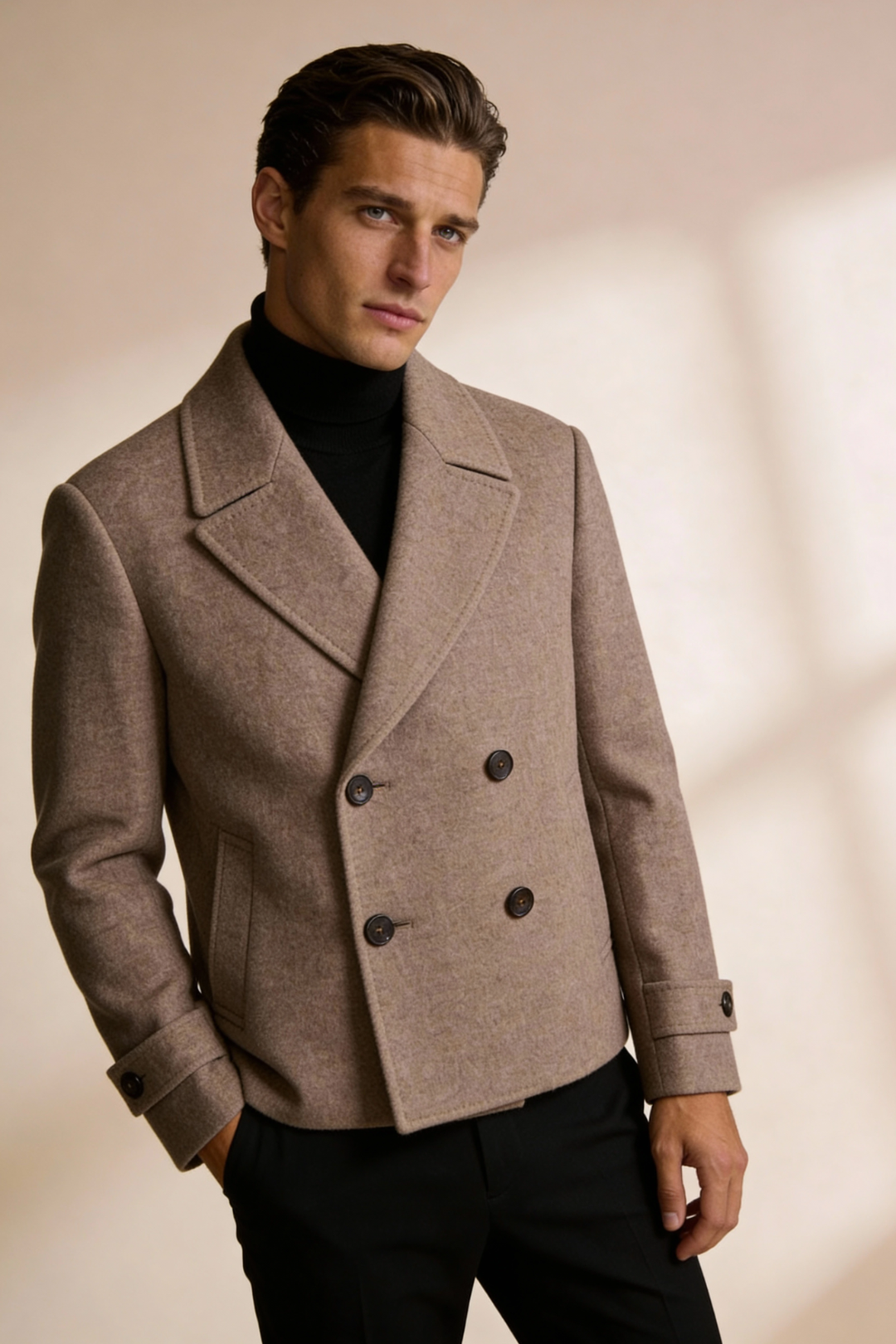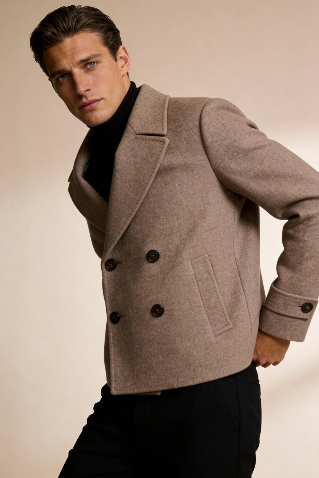 Crafted from luxurious pure wool, this peacoat delivers refined structure and dependable winter warmth. The tailored double-breasted design, wide lapels, and clean cropped silhouette create a polished, modern look that transitions seamlessly from weekday to weekend. A true winter essential built for comfort, confidence, and timeless style.