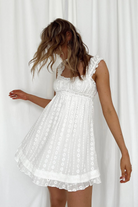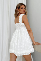 Sweet, breezy, and effortlessly feminine. The white babydoll mini dress features delicate floral eyelet embroidery, ruffled straps, and a flattering empire waist. Lightweight and airy, it’s your go-to for summer days, picnics, or layering with boots for a playful look.