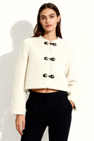A polished women’s faux-shearling toggle jacket in soft ivory. The cropped, boxy fit layers cleanly while gold-tone toggles and contrast tabs add a refined finish. Lined in smooth faux suede brings plush teddy softness for extra comfort and structure. Warmth without bulk from weekday to weekend.