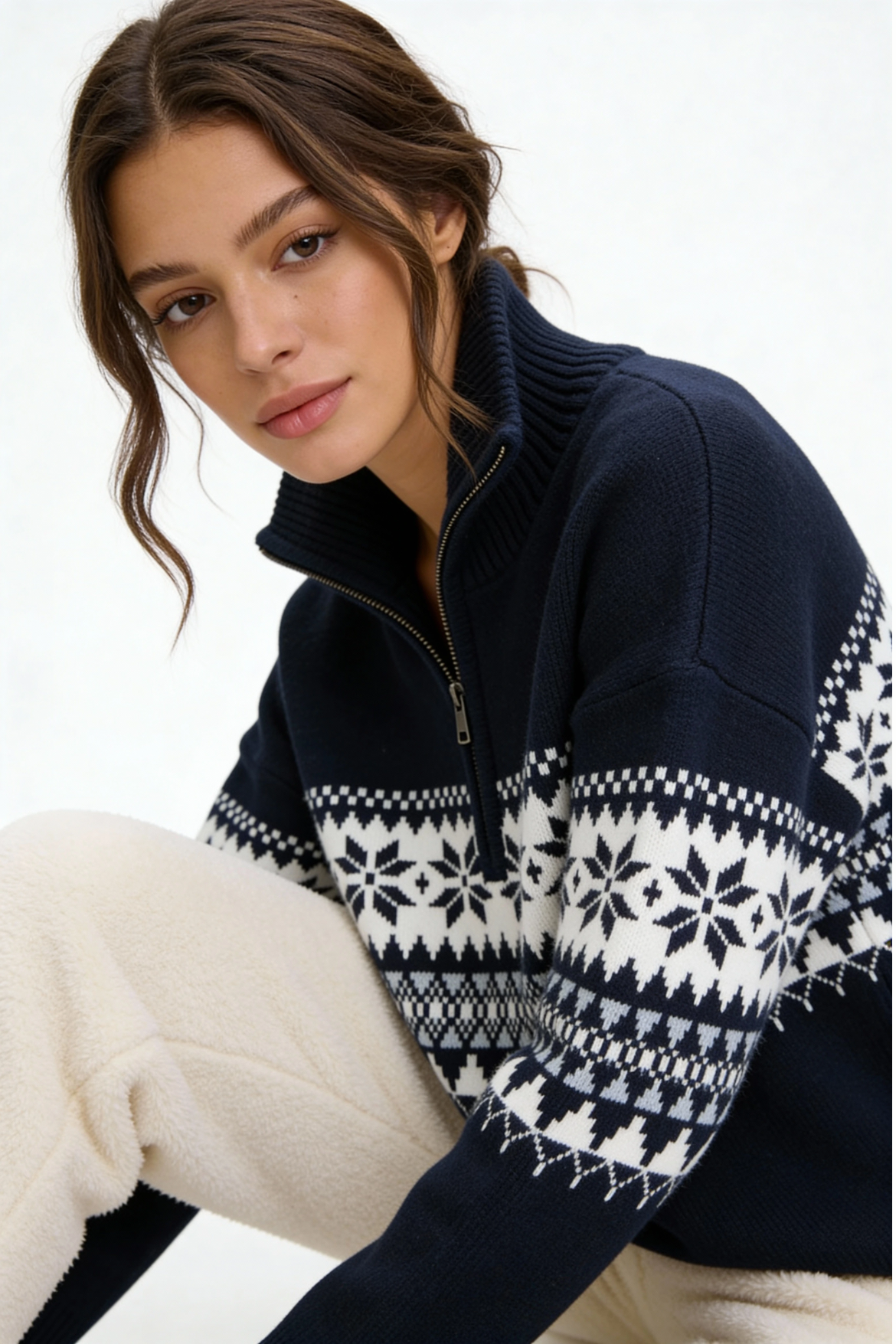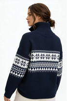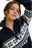 This women's quarter-zip Christmas sweater combines classic Fair Isle patterning with modern winter comfort. The soft, warm knit delivers dependable cold-weather insulation, while the structured high collar and smooth zip closure give it a clean, masculine look. Ideal for holiday gatherings, winter outings, or everyday layering, it’s a timeless seasonal staple with a refined Nordic edge.