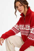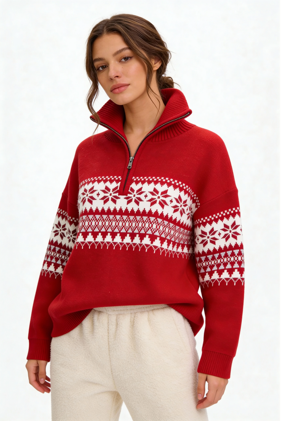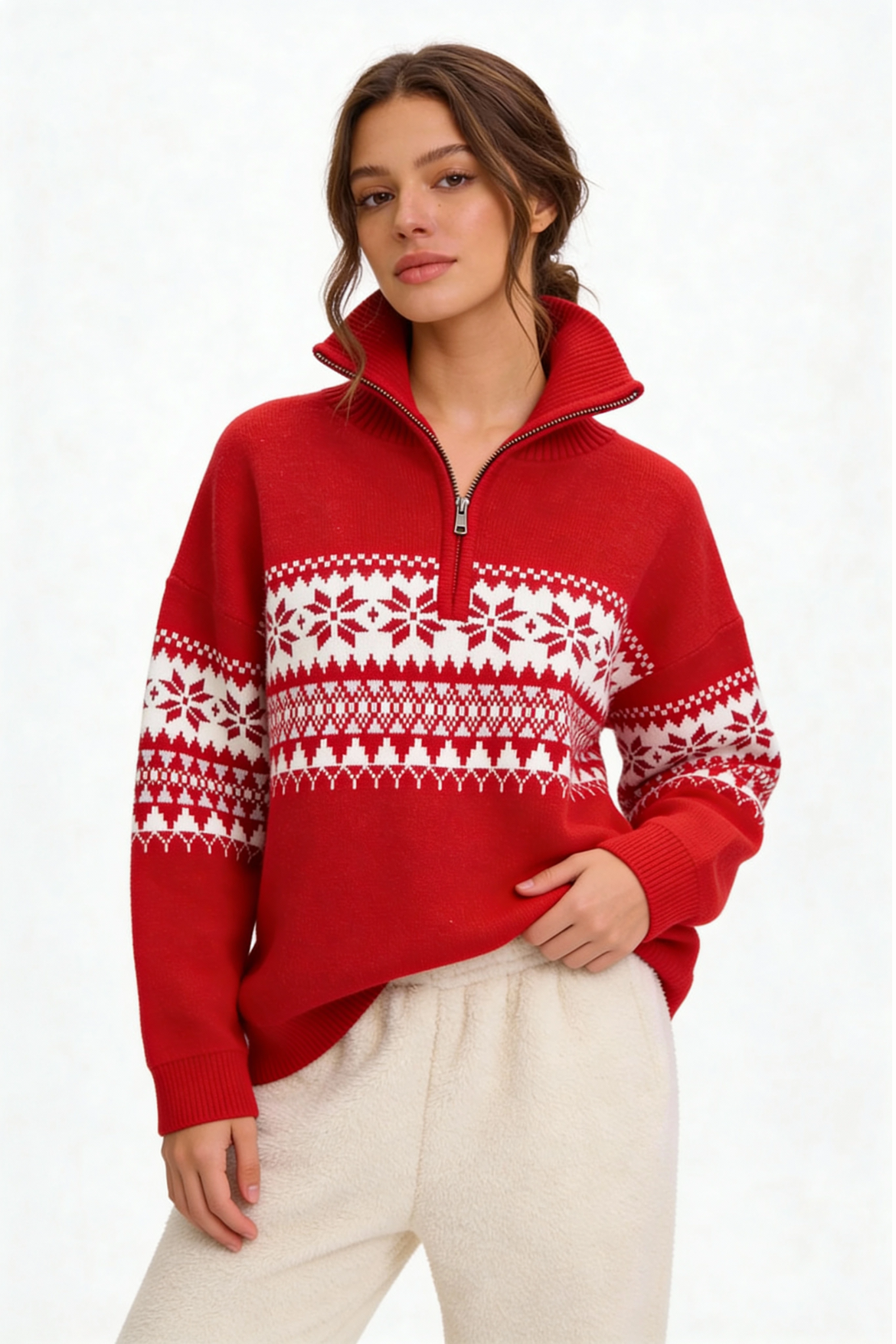 This women's quarter-zip Christmas sweater combines classic Fair Isle patterning with modern winter comfort. The soft, warm knit delivers dependable cold-weather insulation, while the structured high collar and smooth zip closure give it a clean, masculine look. Ideal for holiday gatherings, winter outings, or everyday layering, it’s a timeless seasonal staple with a refined Nordic edge.