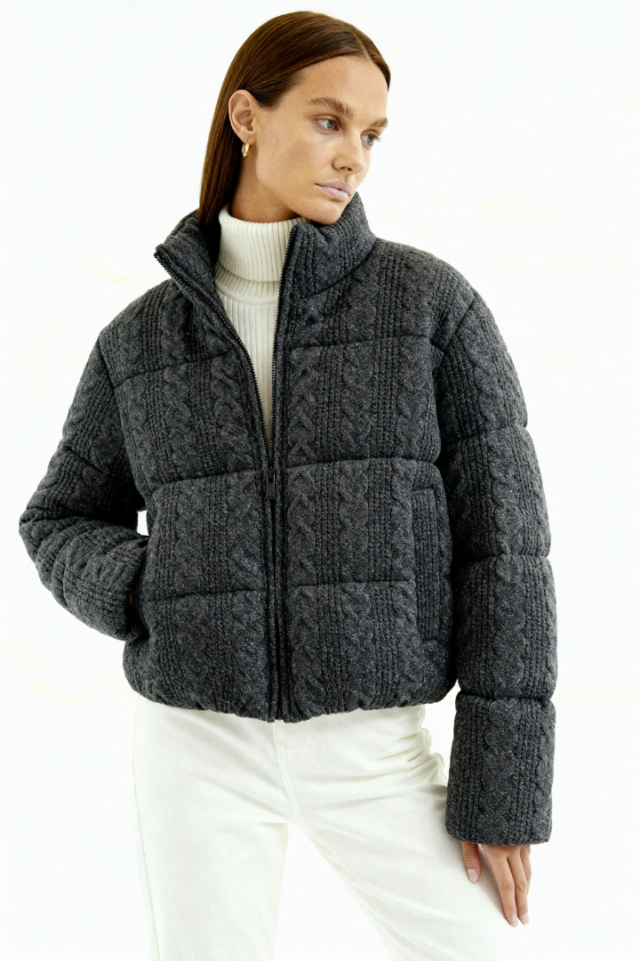 The Mila Cable-Knit Puffer Jacket blends textured softness with modern, lightweight warmth. Designed with a plush cable-knit outer and smooth, quilted insulation, it offers a cozy feel without the bulk. Clean lines, a tall stand collar, and an easy full-zip finish keep it polished — the everyday layer that elevates any cool-weather outfit.