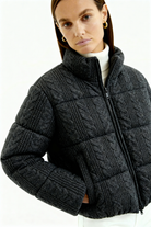 - Plush cable-knit shell with light quilted padding for balanced warmth