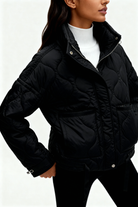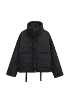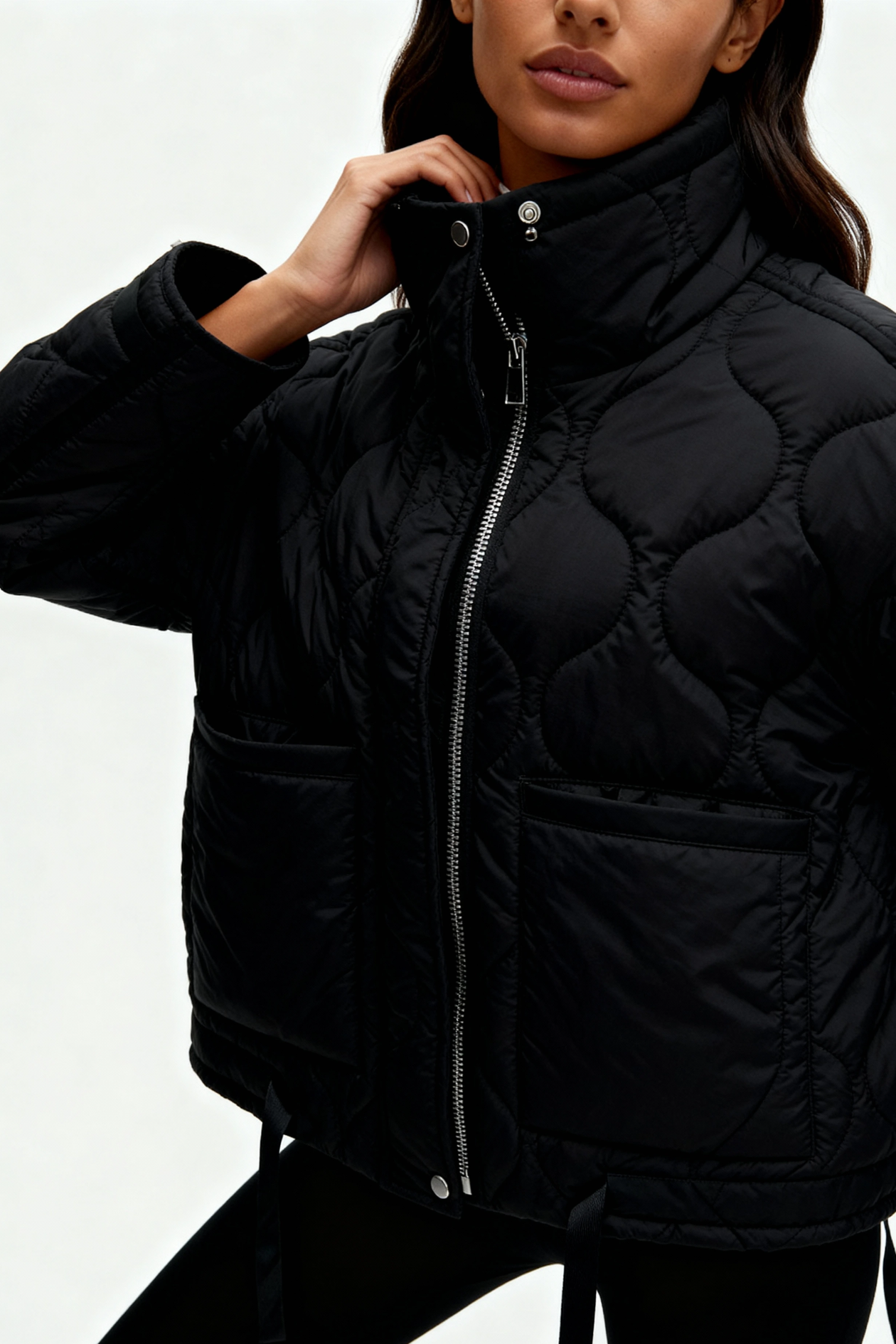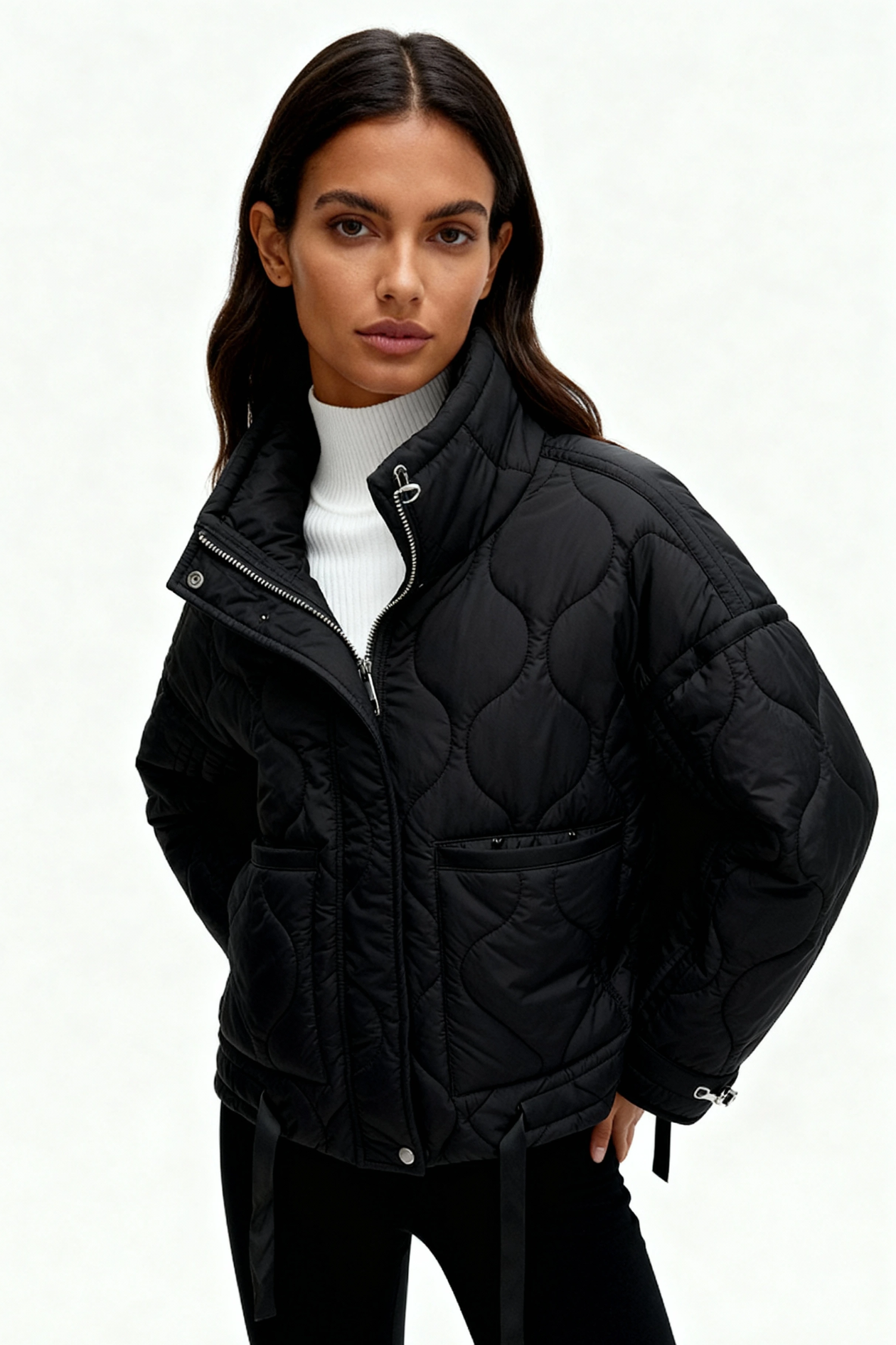 The Riva Oversized Wave Quilt Jacket elevates modern warmth with a clean, architectural edge. Designed with a boxy, slightly cropped silhouette, it layers effortlessly over knits while maintaining a lightweight feel. The high funnel collar and curved wave quilting deliver structure without bulk — a refined update to the classic puffer.