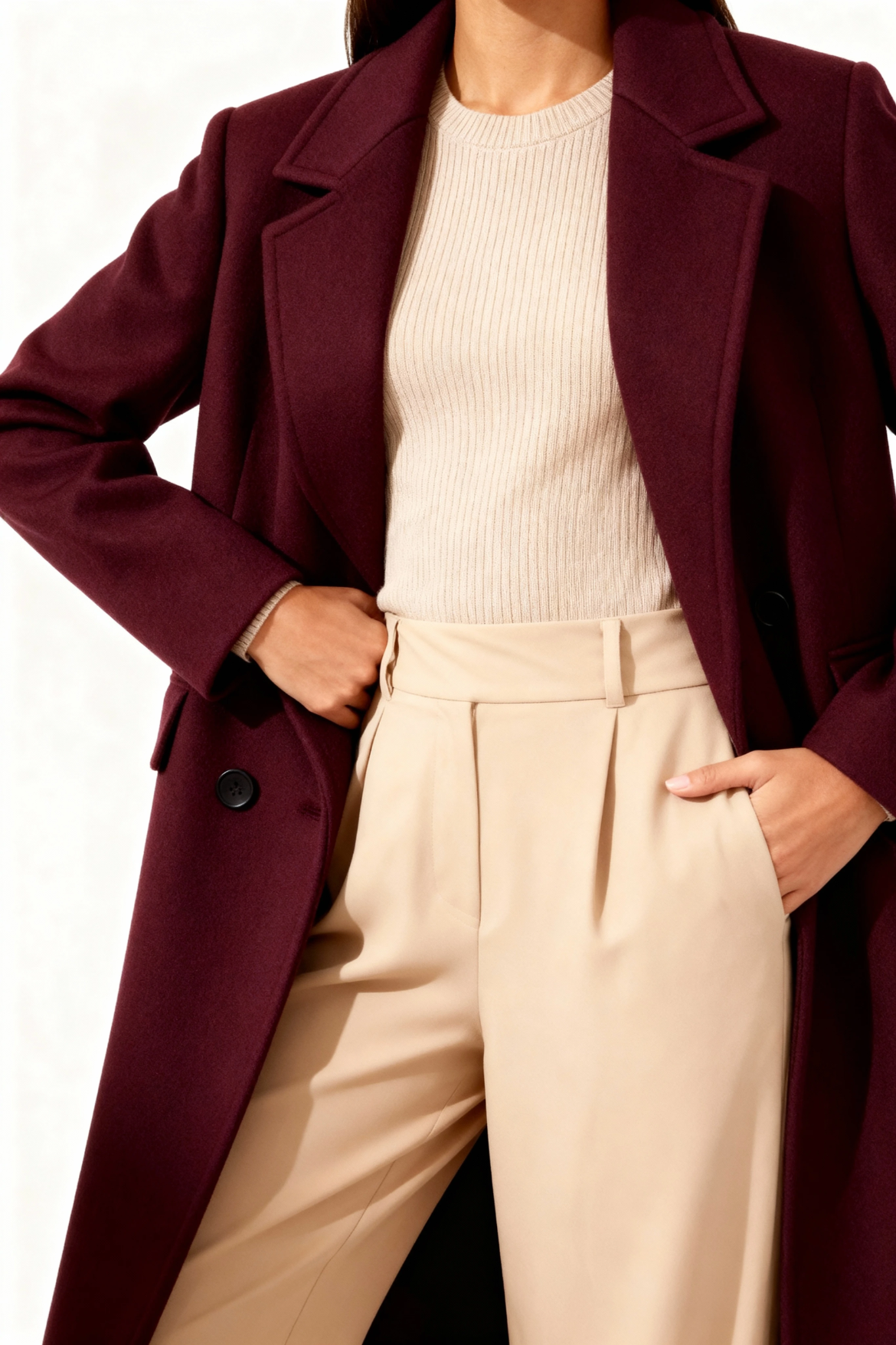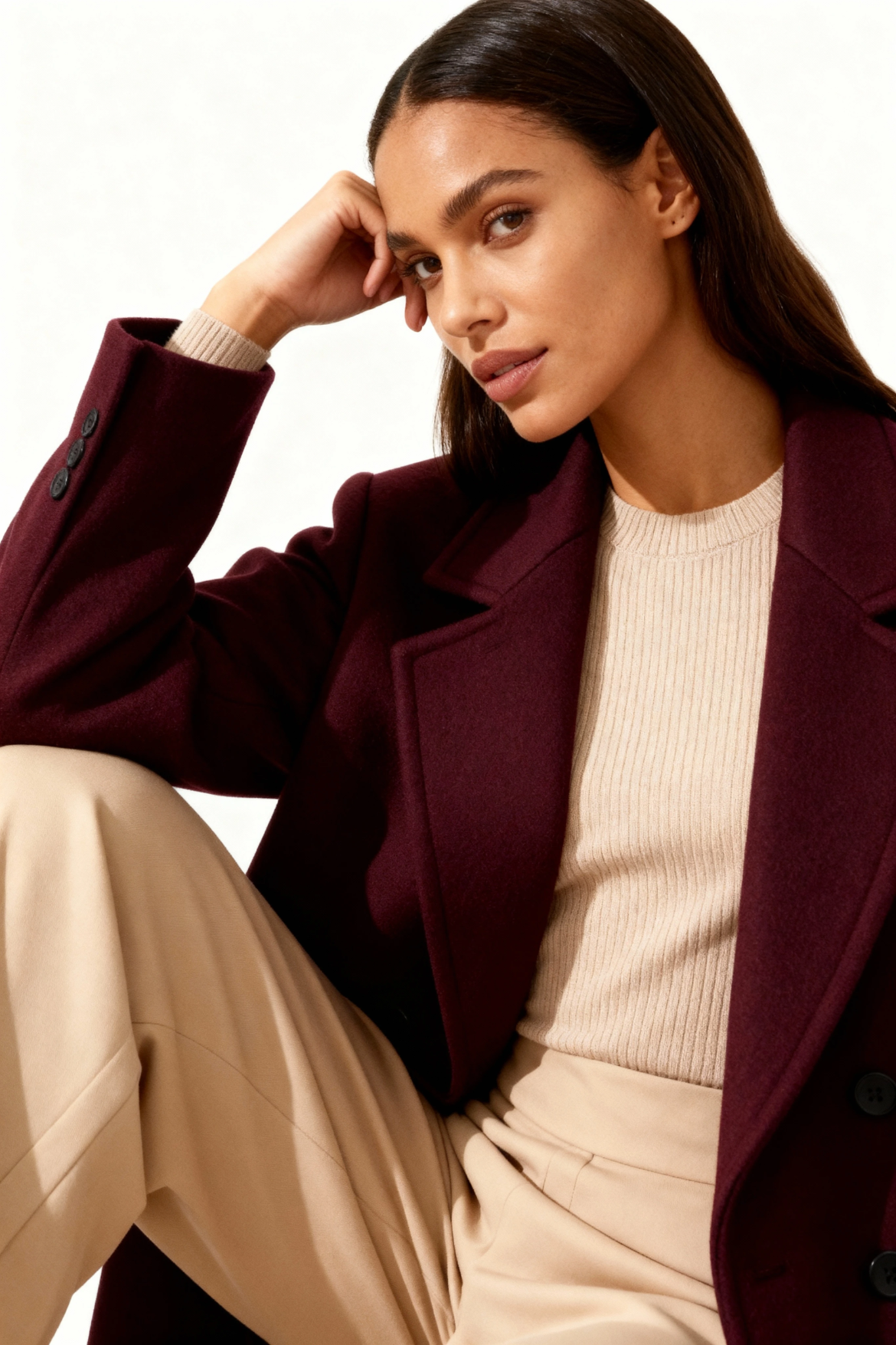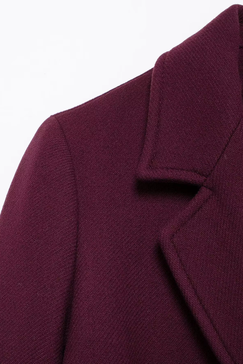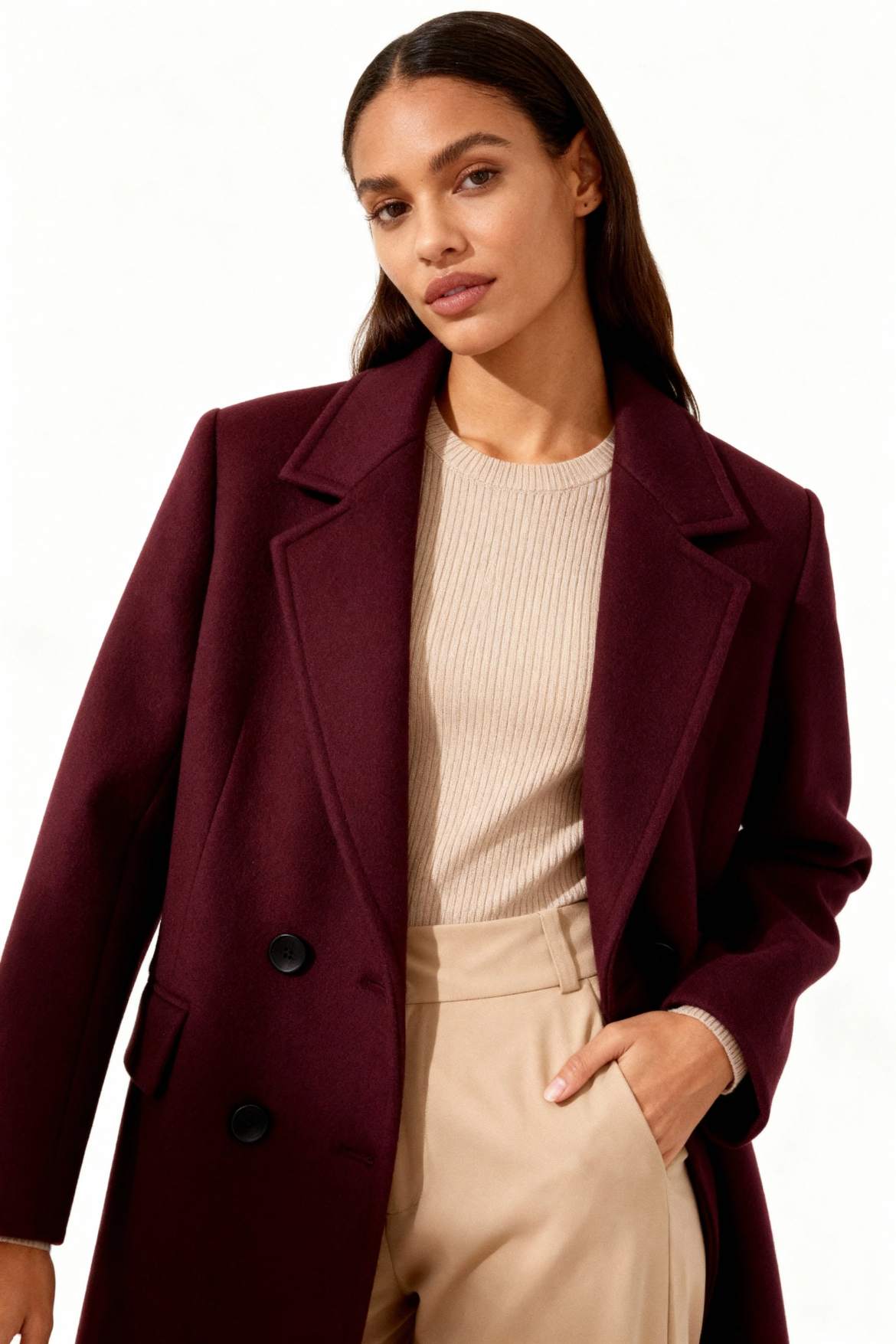 The Elise Burgundy Wool Coat elevates winter dressing with its deep, rich tone and sharp, double-breasted silhouette. Crafted from a soft wool blend, it features structured lapels, clean lines, and front flap pockets for a balanced, polished look. Effortlessly sophisticated and endlessly versatile