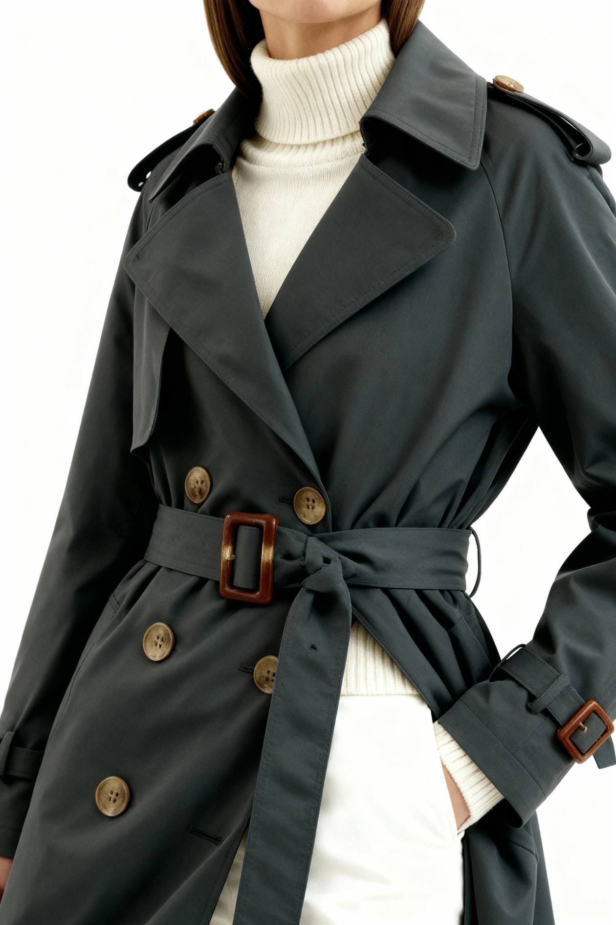 This Liora trench coat is a masterclass in refined outerwear design. With a classic double-breasted cut, structured collar, and a self-tie belt, it offers flattering tailoring that cinches at the waist for a feminine yet powerful silhouette. The durable fabric ensures comfort and ease — ideal for transitional seasons, city commutes, or weekend outings.