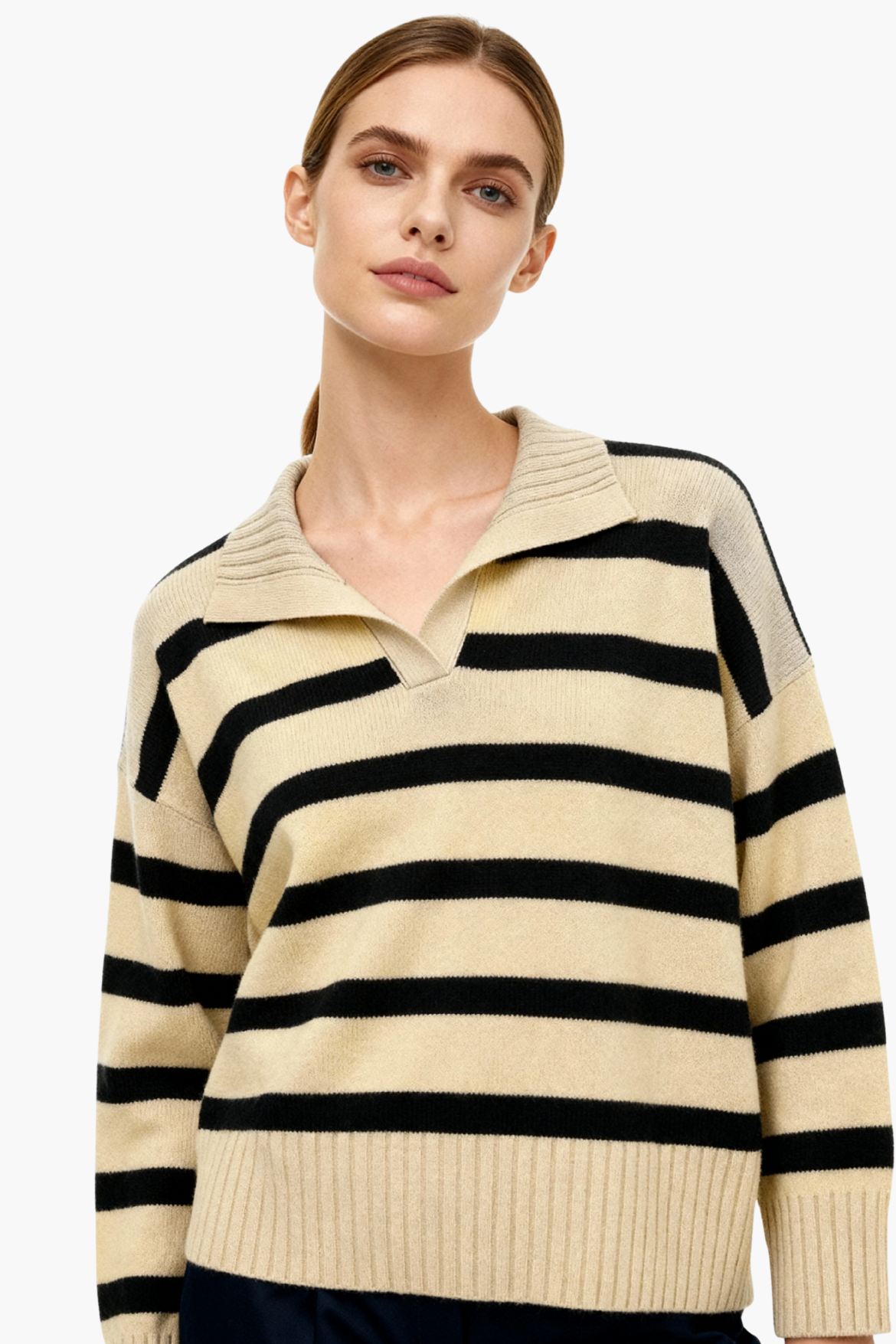 A polished women’s striped polo sweater in beige/black. Crafted from a smooth polyamide–viscose blend that’s no-itch, soft, and comfortable all day. With a collared V-neck, drop shoulders and a relaxed, slightly oversized fit for effortless layering from weekday to weekend. Finished with wide rib cuffs and hem for a clean drape.