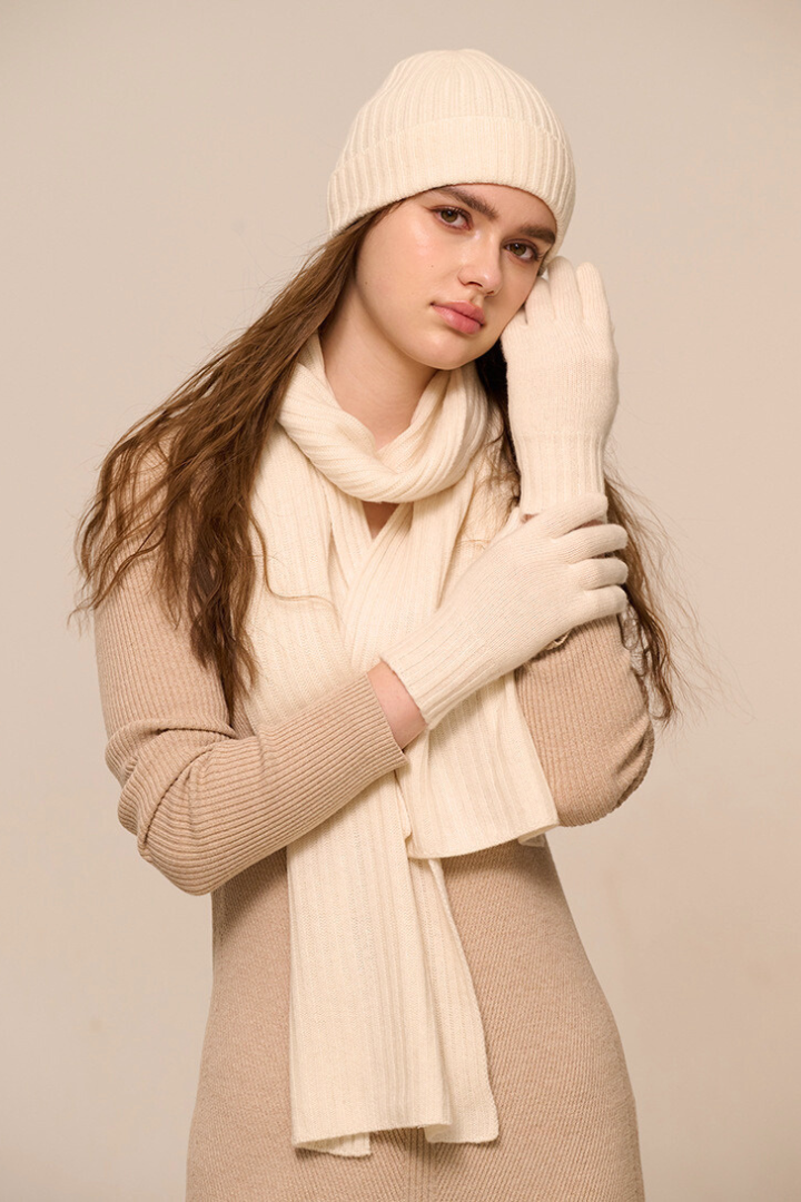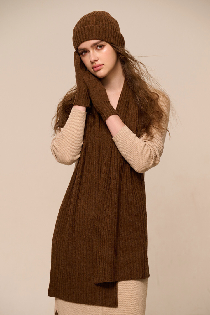 • Design: Clean rib-knit beanie, soft draping scarf with smooth edges