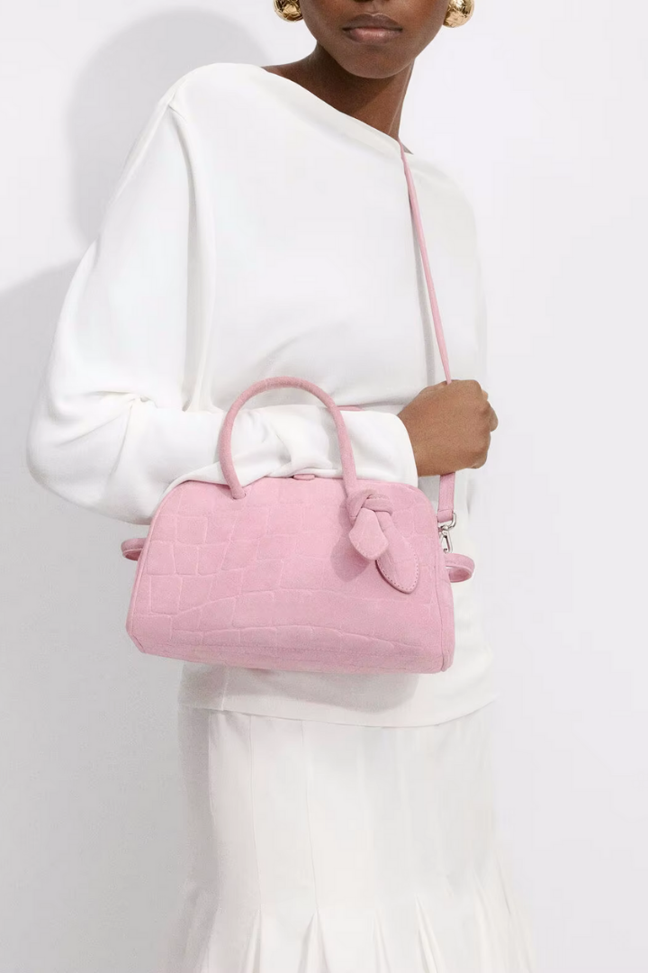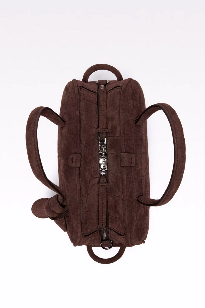 The small version of the Cavora suede croc-embossed handbag blends timeless elegance with everyday versatility. Crafted from soft suede, it features a textured croc pattern, a structured silhouette, and both top handles and a detachable crossbody strap for multiple styling options.