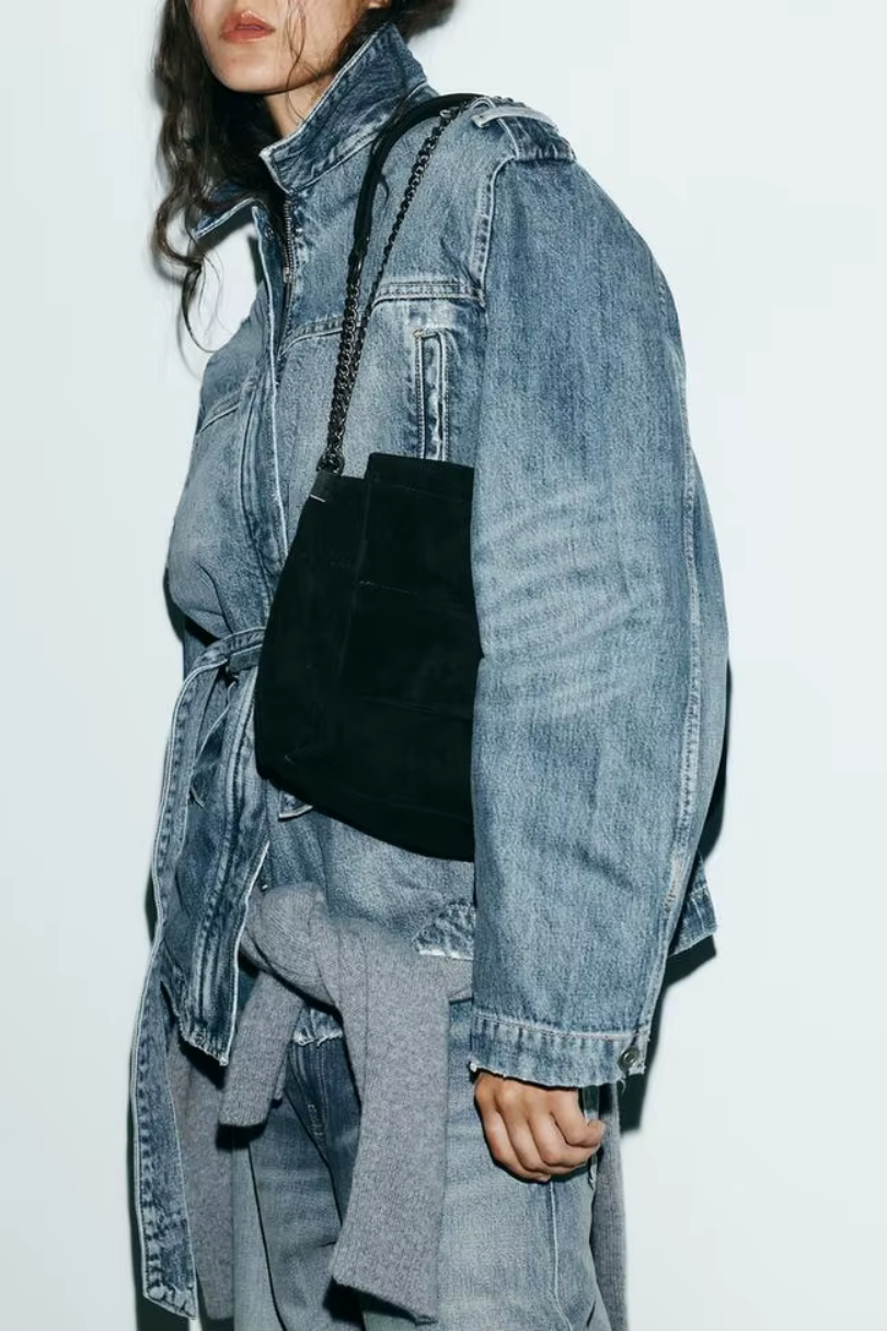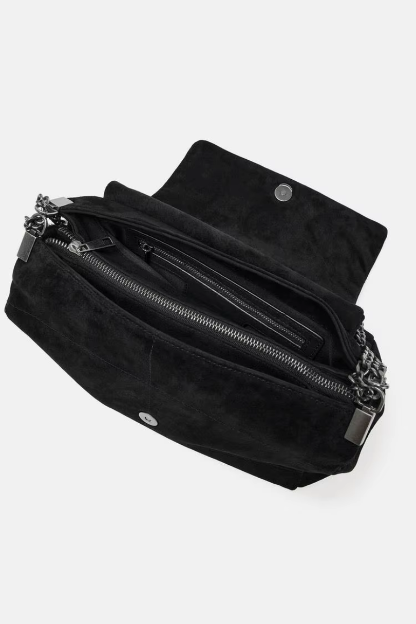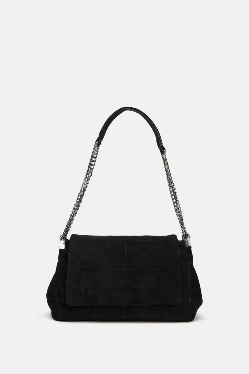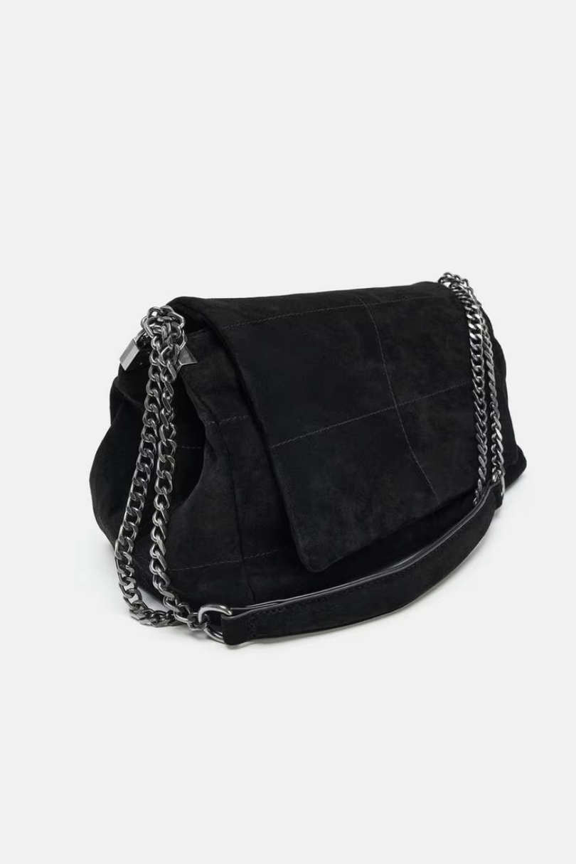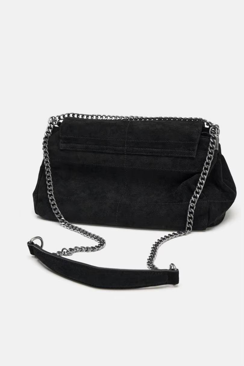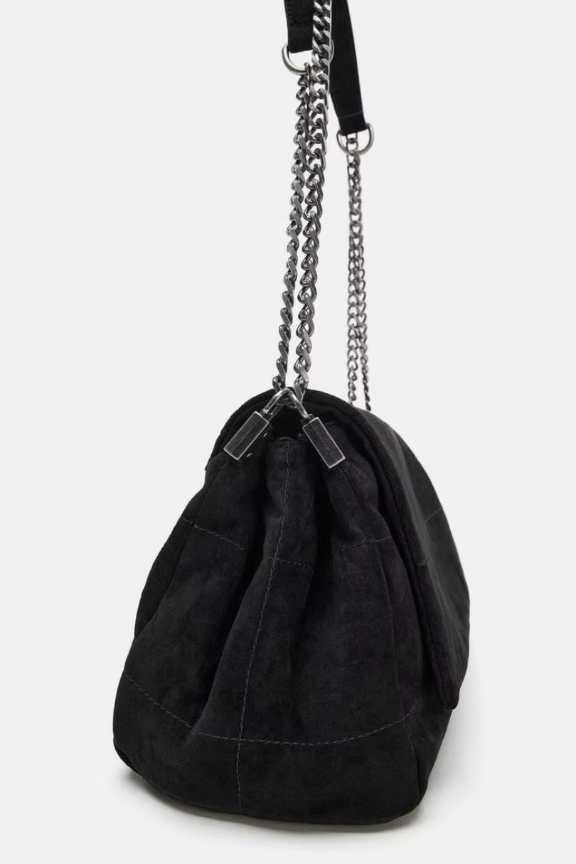 - Handles: Adjustable dual gold chain straps with a soft suede shoulder pad