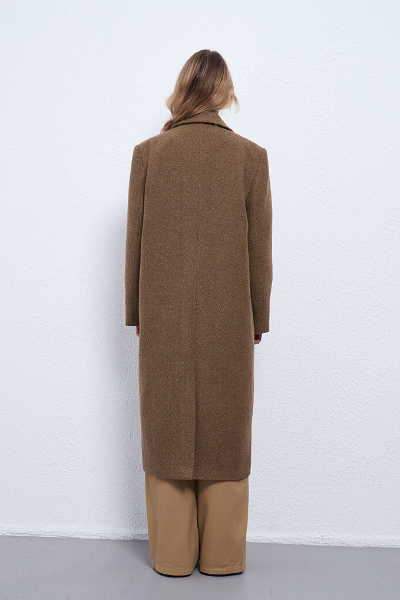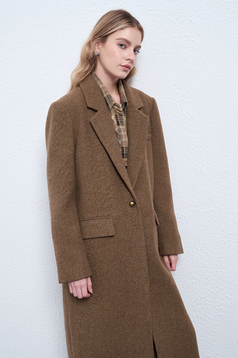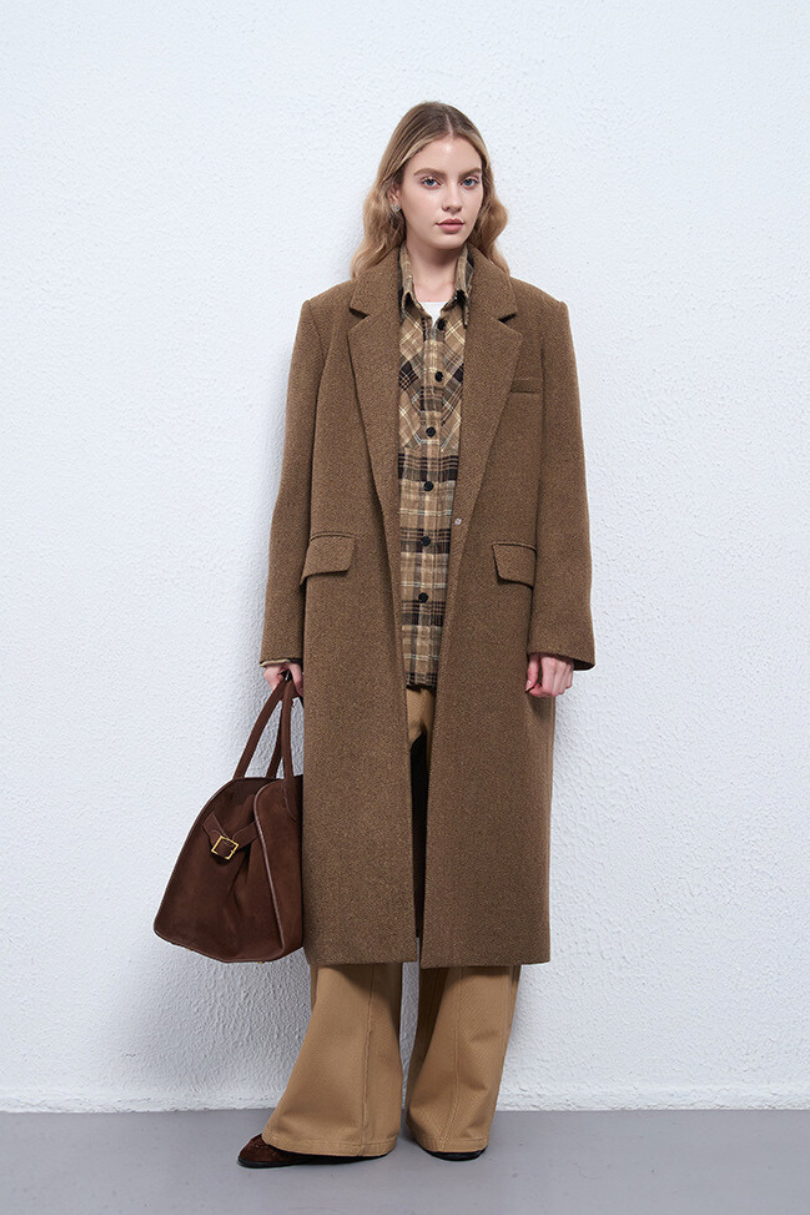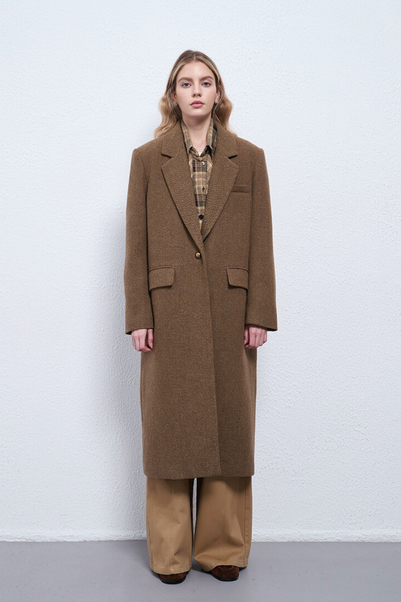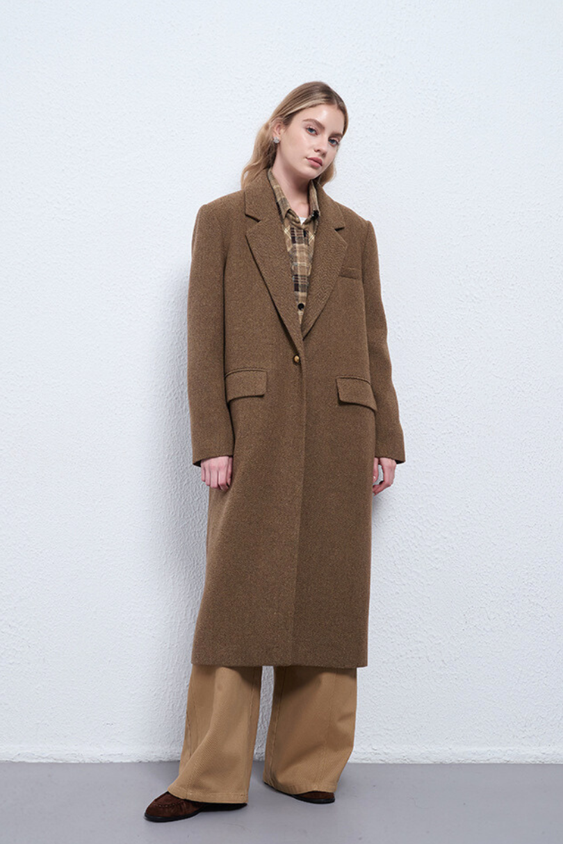 This women’s long wool coat blends classic tailoring with understated elegance. Crafted in a rich camel brown tone, it features a structured shoulder, a refined single-breasted silhouette, and a warm wool texture that elevates any winter look. Designed for both comfort and sophistication, it layers beautifully over knits, workwear, or weekend staples.
