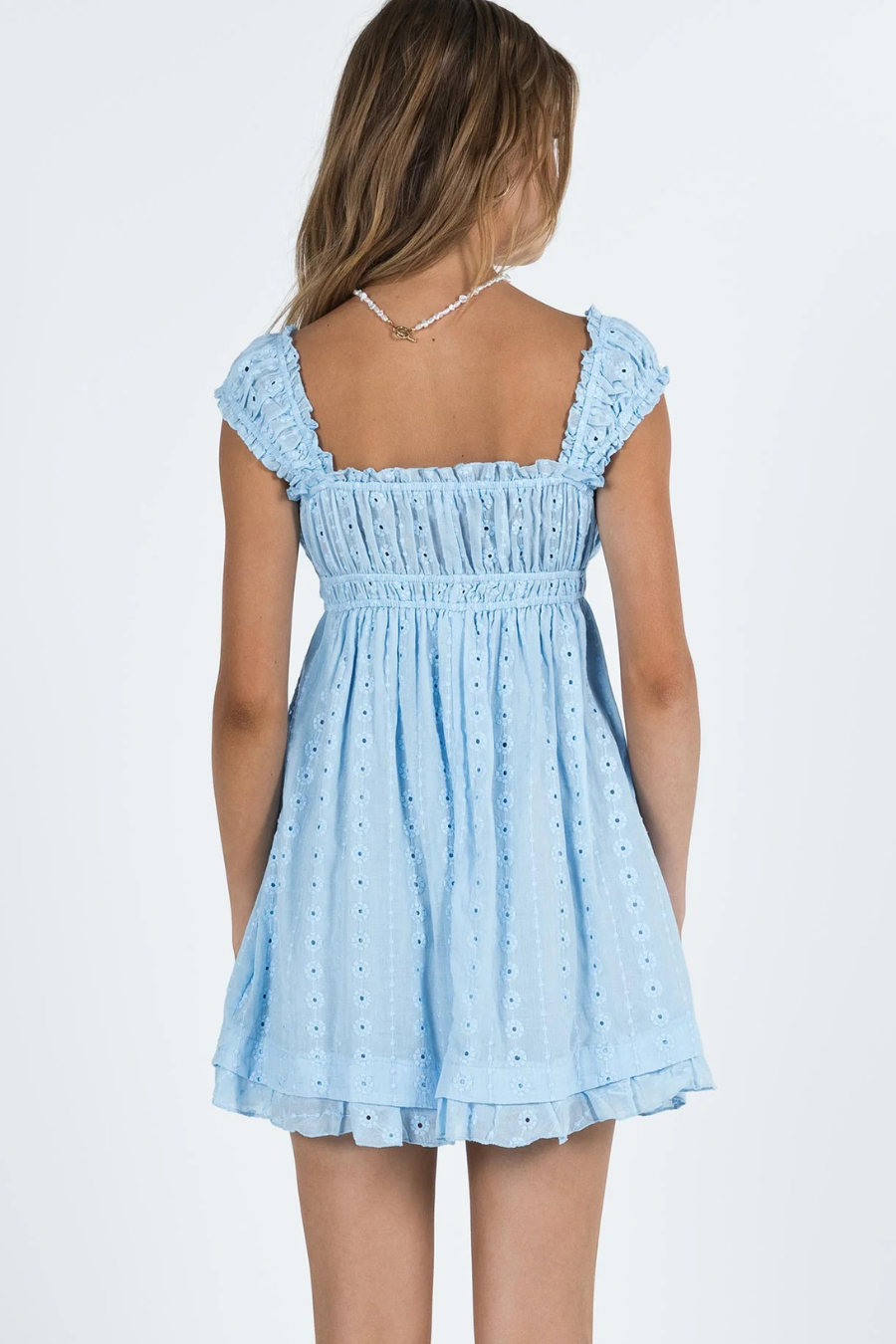 Sweet, breezy, and effortlessly feminine. The blue babydoll mini dress features delicate floral eyelet embroidery, ruffled straps, and a flattering empire waist. Lightweight and airy, it’s your go-to for summer days, picnics, or layering with boots for a playful look.
