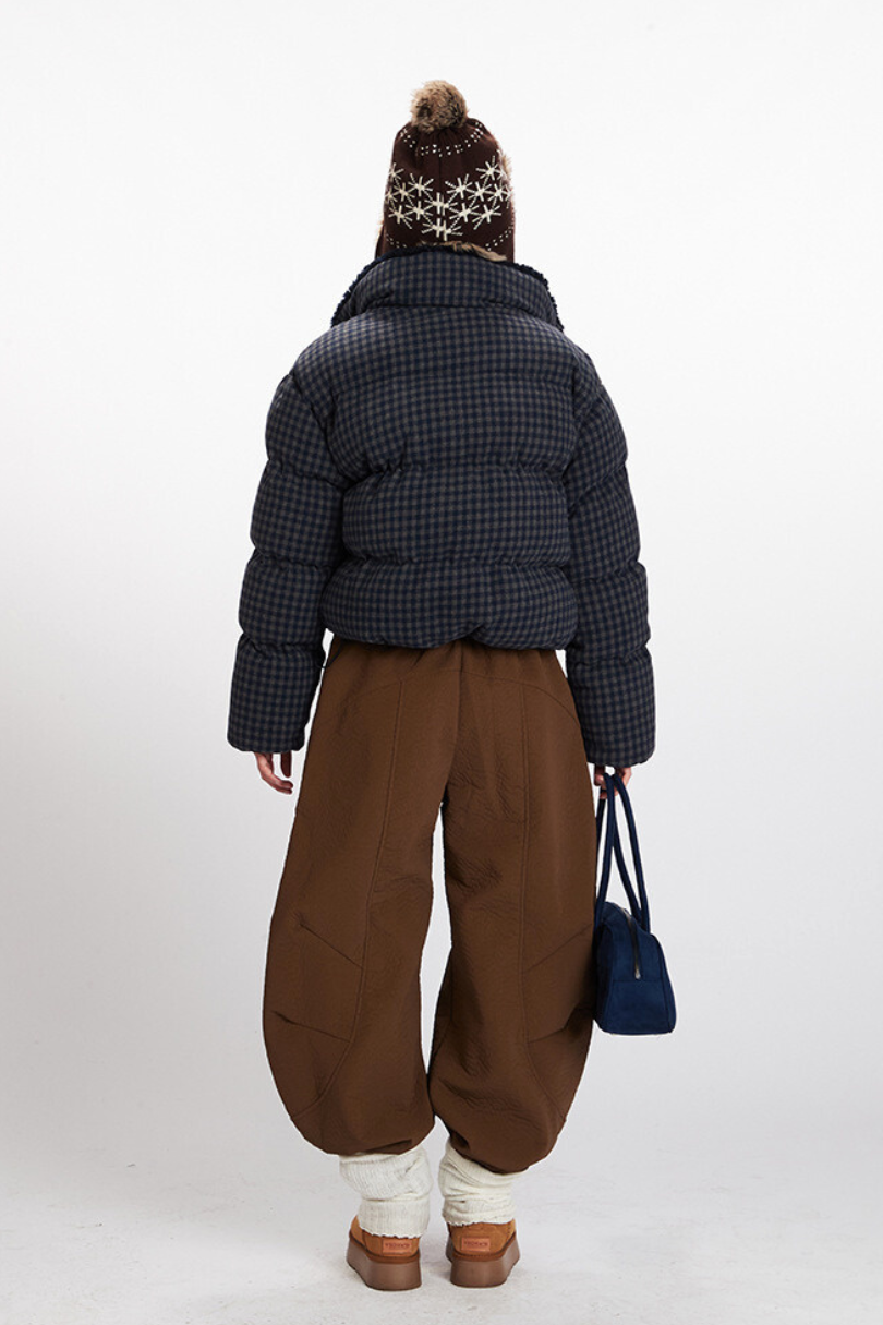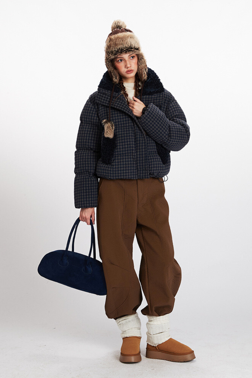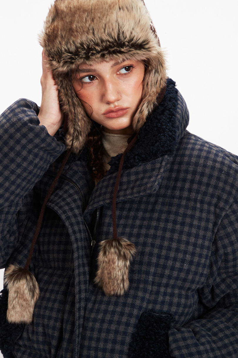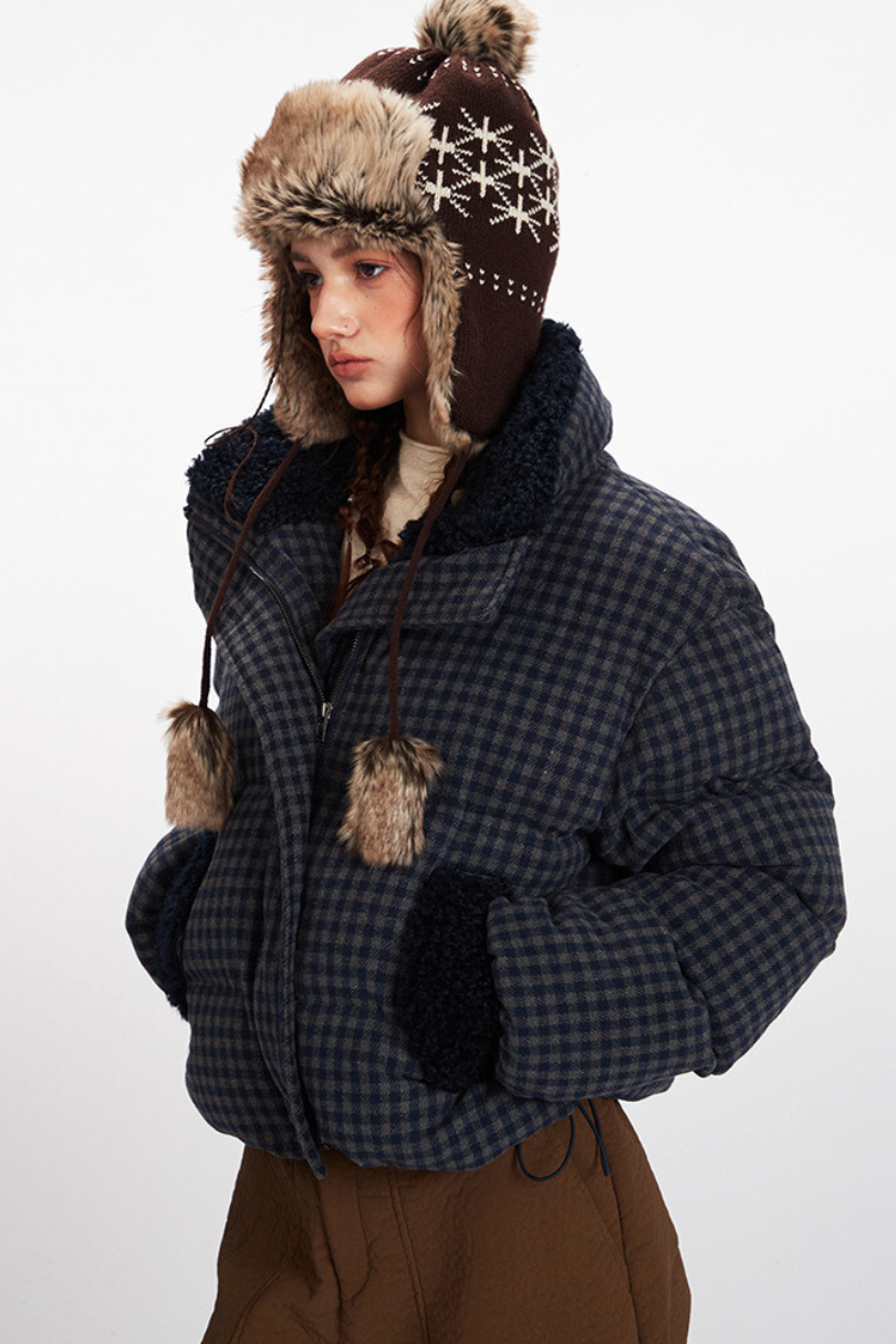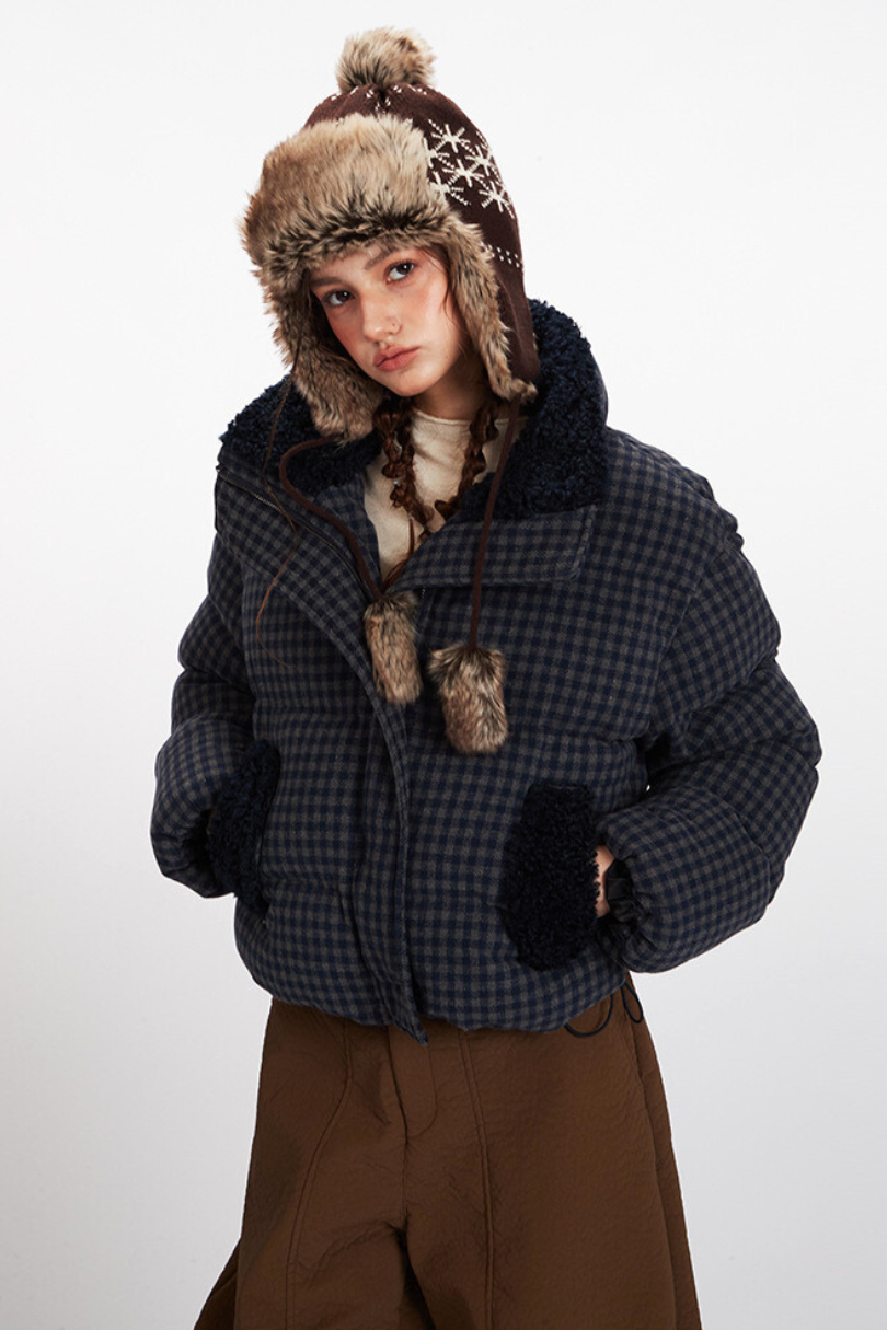 Checkered Sherpa-Trim Puffer Jacket
