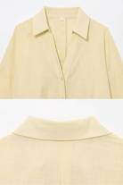 Crisp, modern, and effortless. This women’s shirt is cut from breathable cotton-blend poplin with an oversized fit, 3/4 sleeves, and a modern high-low hem. In butter yellow, it’s the versatile piece that works from desk to dinner with ease.
