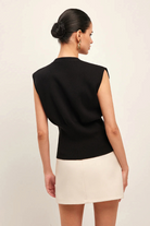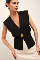 Minimalist yet statement-making. This women’s sleeveless knit vest in black is designed with a sharp deep V-neckline and a bold gold statement button. Its waist-fitted silhouette adds structure and elegance, making it perfect for both office layering and elevated evening styling.