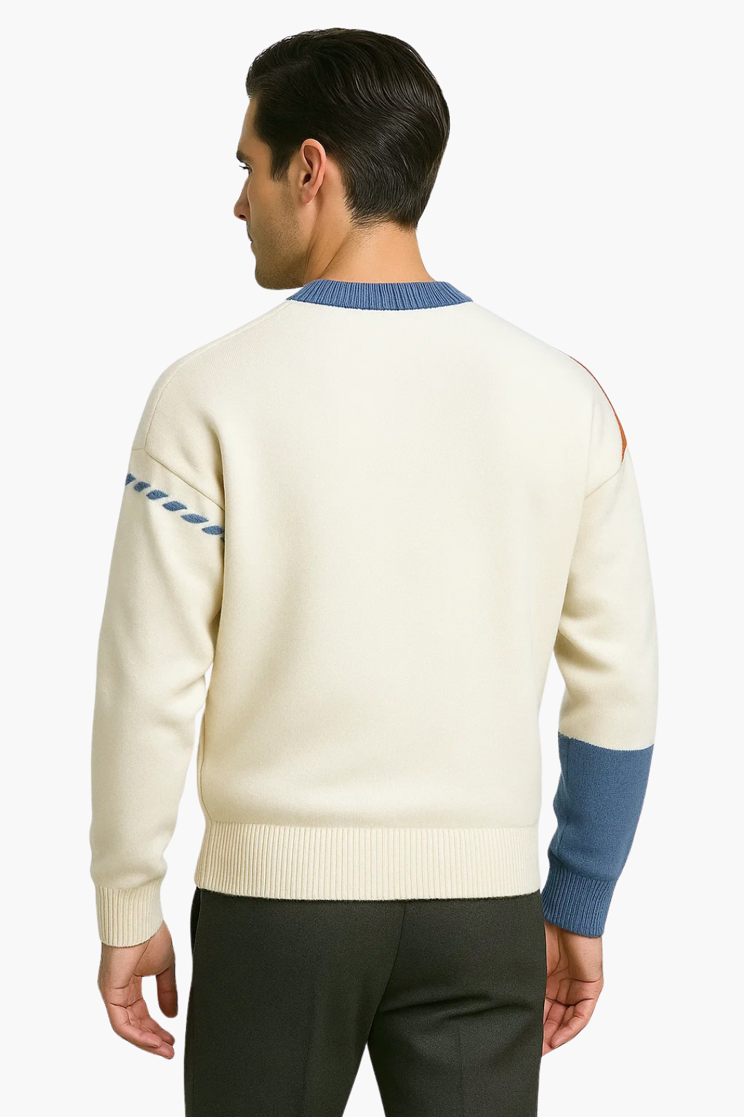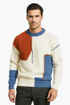 The Artisan Knit Sweater blends cream softness with bold rust and dusty blue accents, finished with contrast stitching that sets it apart from the everyday knit. With its patchwork-inspired design and cozy feel, it’s the piece that adds character to your cool-weather rotation.