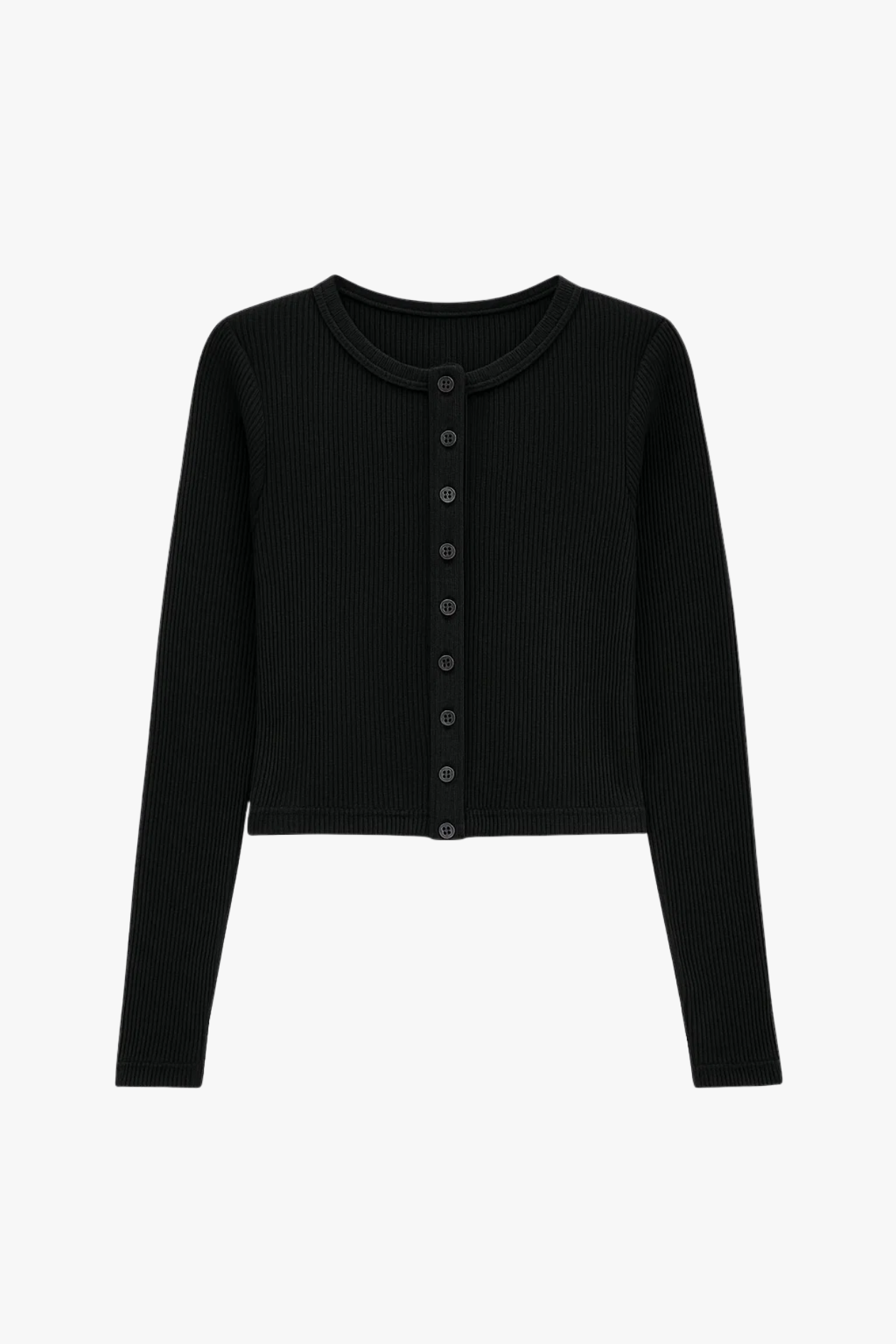 A polished women’s ribbed button-front long sleeve top in black. Cut in a cropped, slim silhouette with an off-center placket and soft stretch knit for all-day comfort and clean layering. Style it buttoned up or slightly open for easy polish.