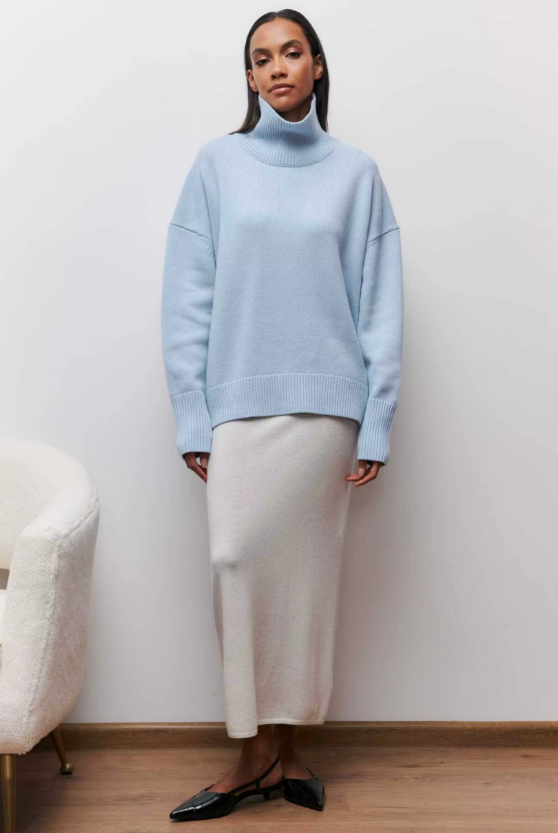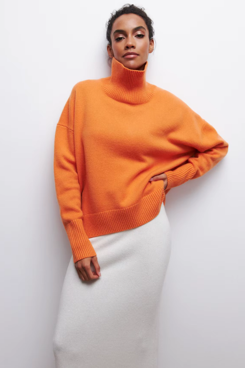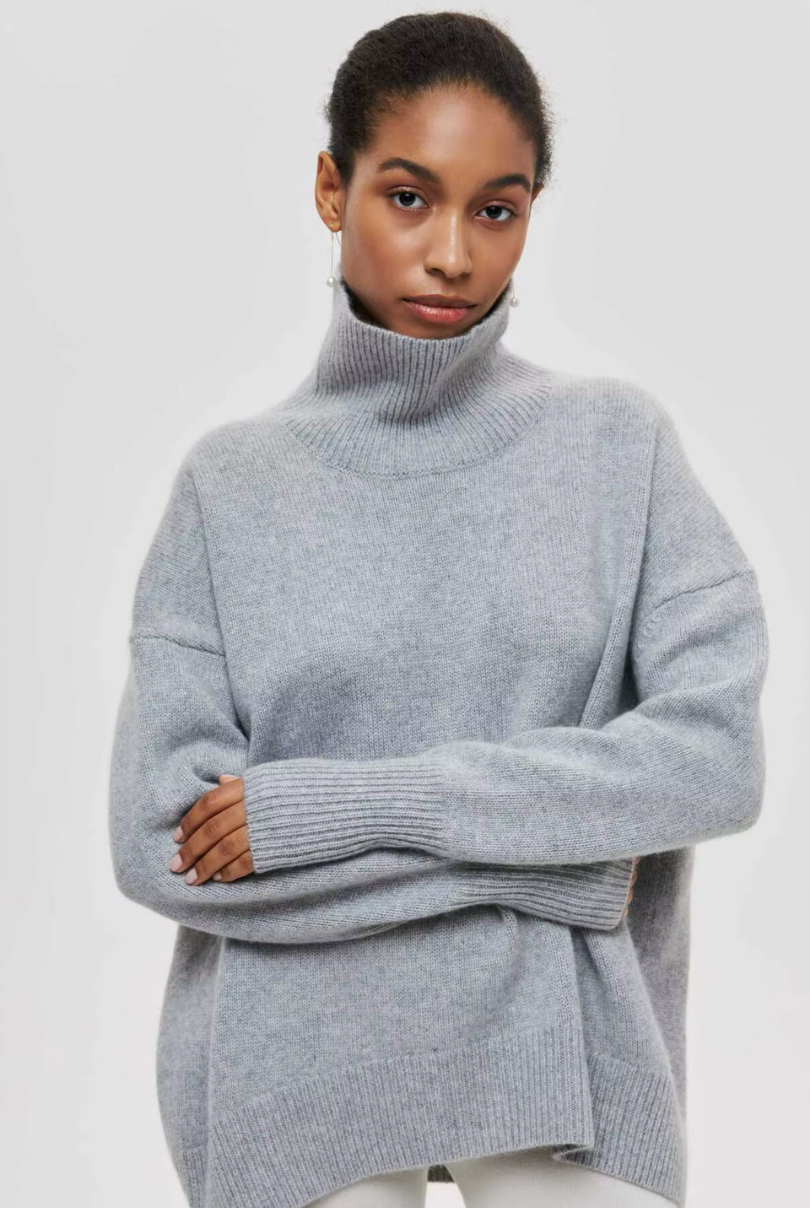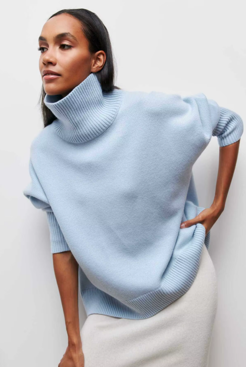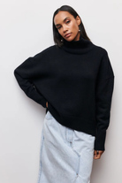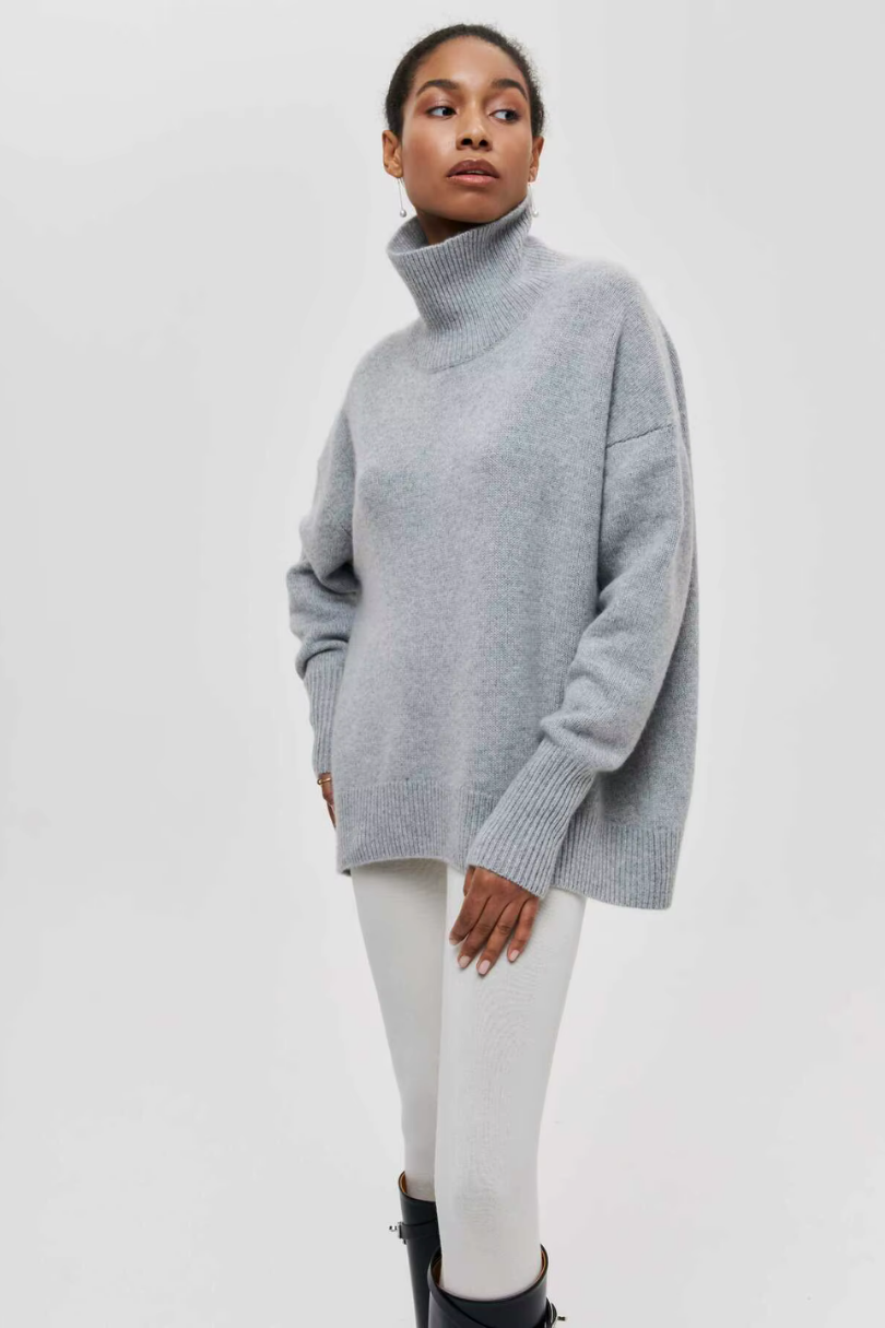 This oversized turtleneck sweater brings effortless sophistication to cold-weather styling. Designed with a relaxed silhouette and ribbed trims, it blends everyday comfort with polished knitwear elegance. Wear it solo for a statement or layer under coats for added warmth.