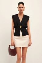 Minimalist yet statement-making. This women’s sleeveless knit vest in black is designed with a sharp deep V-neckline and a bold gold statement button. Its waist-fitted silhouette adds structure and elegance, making it perfect for both office layering and elevated evening styling.