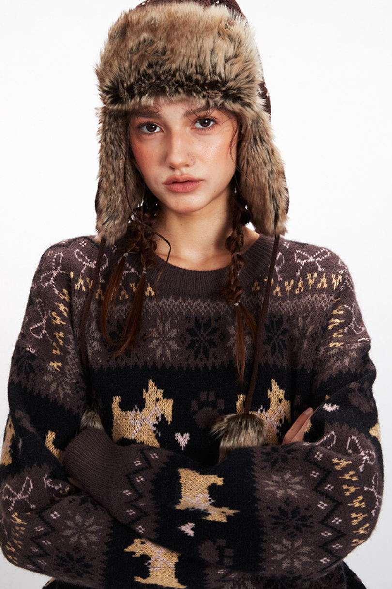 This women’s Fair Isle dog sweater blends nostalgic winter charm with everyday comfort. Designed in warm chocolate tones, it features a playful dog motif, classic Fair Isle patterning, and a relaxed oversized fit that feels effortlessly cozy. Perfect for cold-weather layering, holiday outings, or adding a touch of personality to your winter wardrobe, it delivers both warmth and style in one irresistibly soft knit.