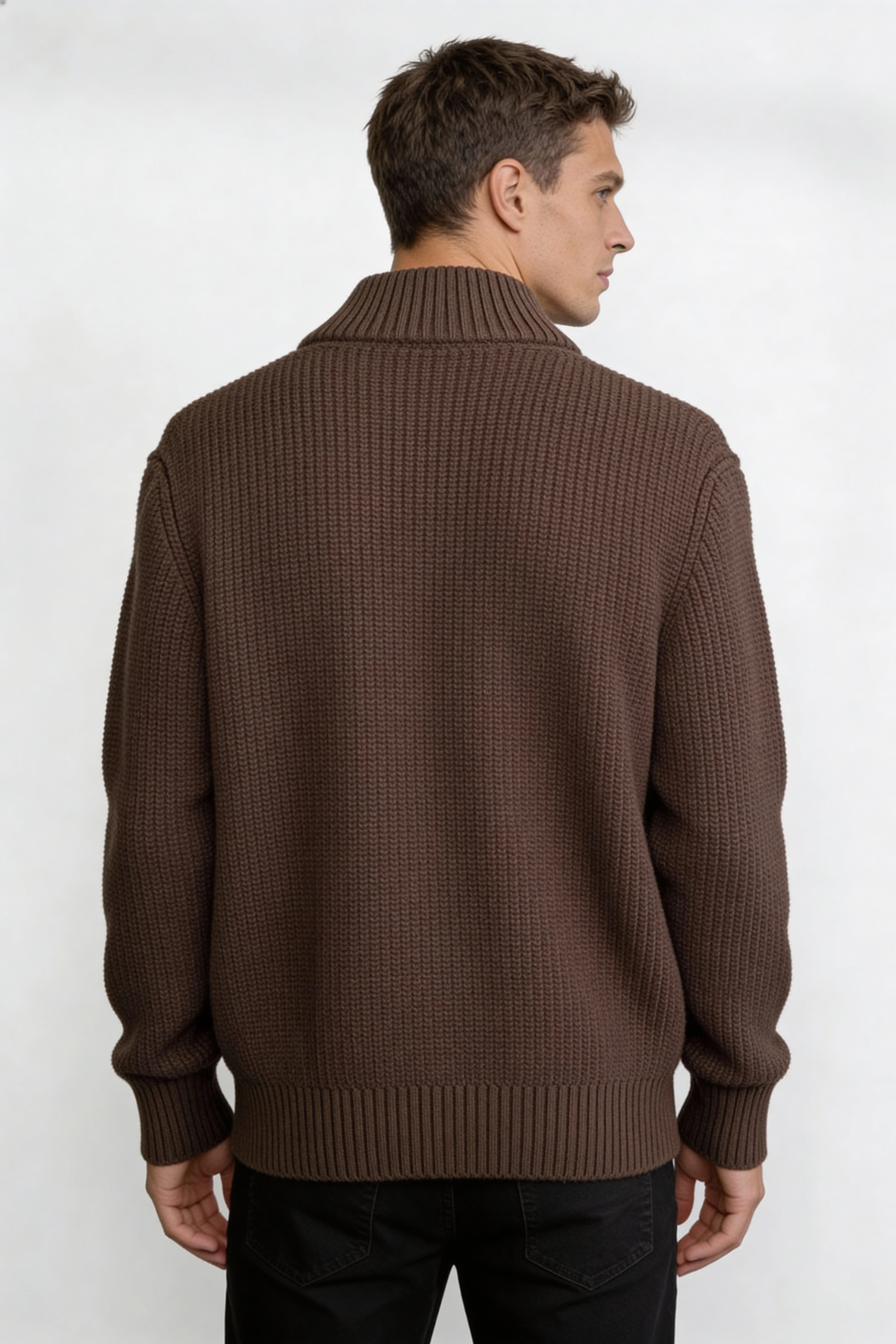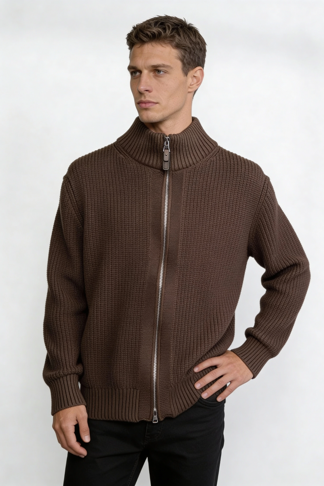 Designed for effortless everyday wear, this men’s zip-up sweater jacket is crafted from 100% cotton for breathable comfort and natural softness. The ribbed knit texture adds subtle structure, while the full-zip front and stand collar create a clean, modern silhouette. Easy to layer yet polished on its own, this cotton sweater jacket transitions seamlessly from casual days to smart off-duty looks.