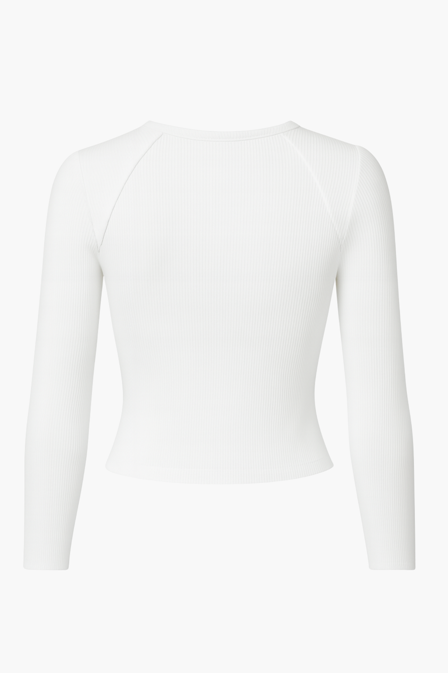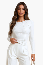 A polished take on the everyday essential. This white ribbed contour top is designed with slim seam detailing that flatters the figure while keeping the look modern and versatile. Perfect for pairing with tailored trousers, skirts, or jeans.