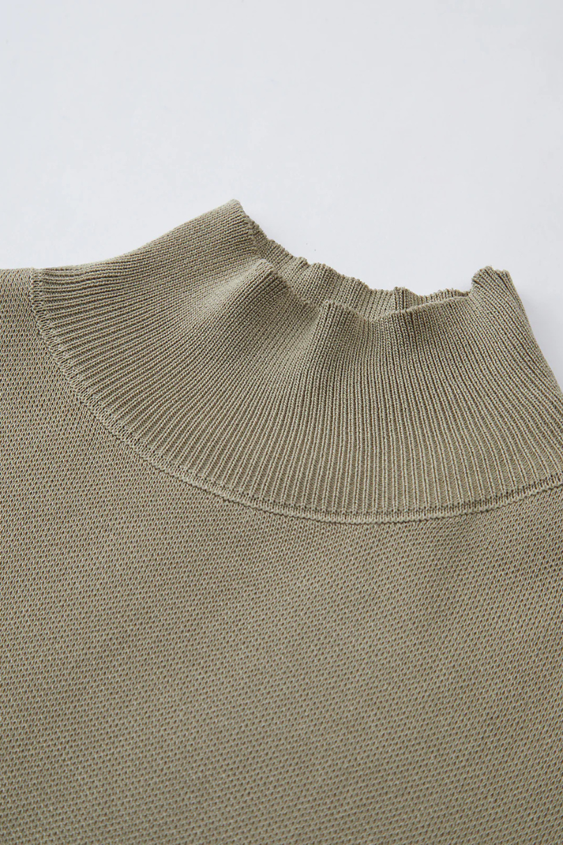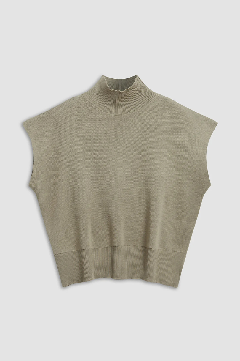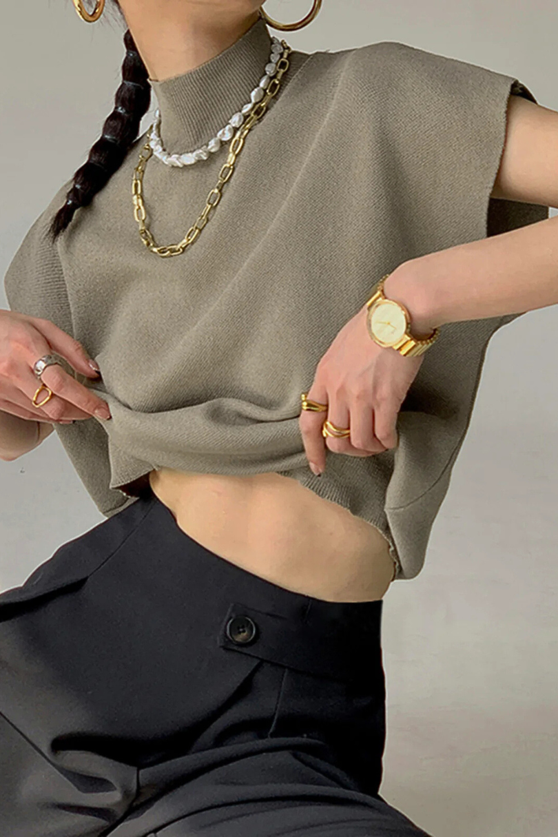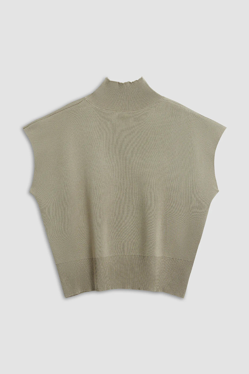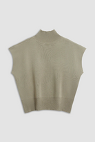 Refined, simple and elegant. This sleeveless knit vest in khaki brings effortless elegance with its mock neck, relaxed fit, and soft lightweight texture. Perfect on its own or styled over shirts and under blazers, it’s a timeless piece for versatile everyday outfits.